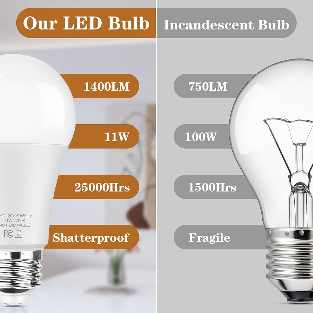Long Lifespan & Less Energy Consumption: This A19 LED bulbs have a highly long-lasting lifetime up to 25000h, compared with normal incandescent bulbs with only works for 1500h, drastically reduce the frequency of bulb changes and effectively protect the environment while providing the same lighting effect
