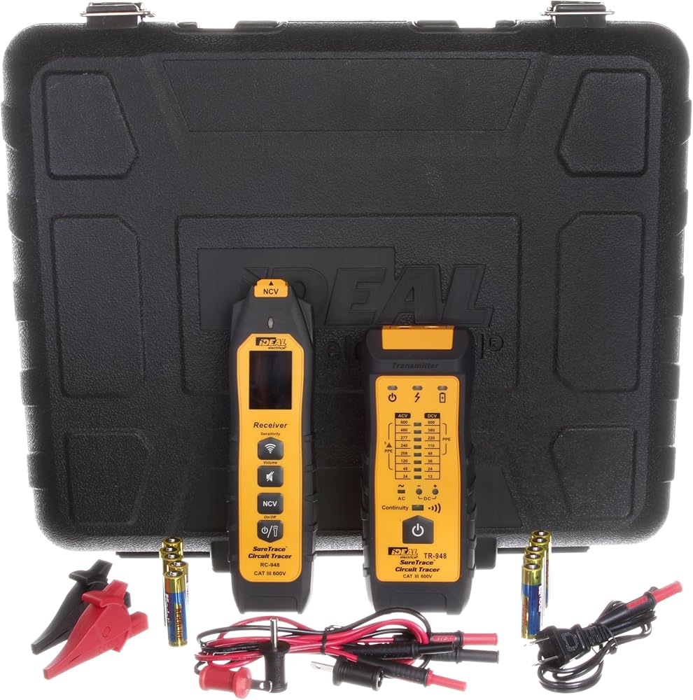 The IDEAL 61-948 SureTrace PLUS Open/Close Circuit Tracer is a CAT III 600 V rated digital circuit tracer that provides an easy-to-use trouble shooting tool for finding: breakers and fuses; conductors in walls, ceilings, and floors; dead shorts; opens on conductors; splice errors (shared neutrals). It can be used on energized and de-energized systems as well as 3-Phase systems carrying up to 600 V AC/DC (50 and 60 HZ). Dual high visibility displays on the receiver are visible in all conditions and positions and feature a patented 180° main rotating display and patented TightSight secondary display that make high/low tracing and breaker identification in tight spaces easier and eliminates the need to place you head near panels/conductors to see the main display. A non-contact sensor in the tip of the receiver detects and indicates the presence of AC voltage between 40V to 600V via a red flashing light and audible beep that change in frequency as its proximity to the voltage source changes. A built-in work light is provided for work in poor lighting conditions. The Transmitter features a patent pending built-in continuity test eliminating the need for a second continuity tester when searching for wiring faults (shorts) and it indicates 8 different voltage levels between 24 - 600 V AC and 12 to 600 V DC as well as DC polarity. It features a magnetic/hook strap clip for hands free use (strap sold separately) and has an integrated kick stand for set up on flat surfaces. The Receiver and Transmitter have an industrial grade over molding that enhances grip and drop protection. The kit includes an AC two bladed receptacle plug with banana plugs, a pair of 3-foot-long leads, 2 Alligator Clips, one ground Adapter and 2 blade adapters that attach to the lead set. The kit comes with 10 1.5V AA Batteries and an easy open, fully accessible hard case with a handle that allows for Tracer Receiver, Transmitter, battery, and extra accessory storage.