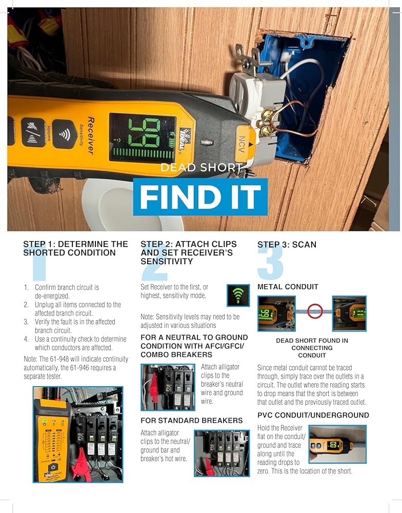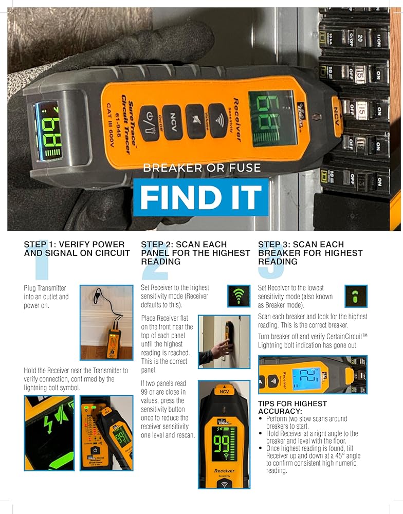 Receiver features dual high visibility displays visible in all conditions/positions via a patented 180° main display and patented TightSight secondary display making high/low tracing and breaker identification in tight spaces easier, Features Certain Circuit technology for quick breaker/fuse confirmation and live circuit identification, Finds; Breakers and Fuses, Splice Errors, Dead Shorts, Energized/De-Energized Conductors in Walls, Ceilings and Floors