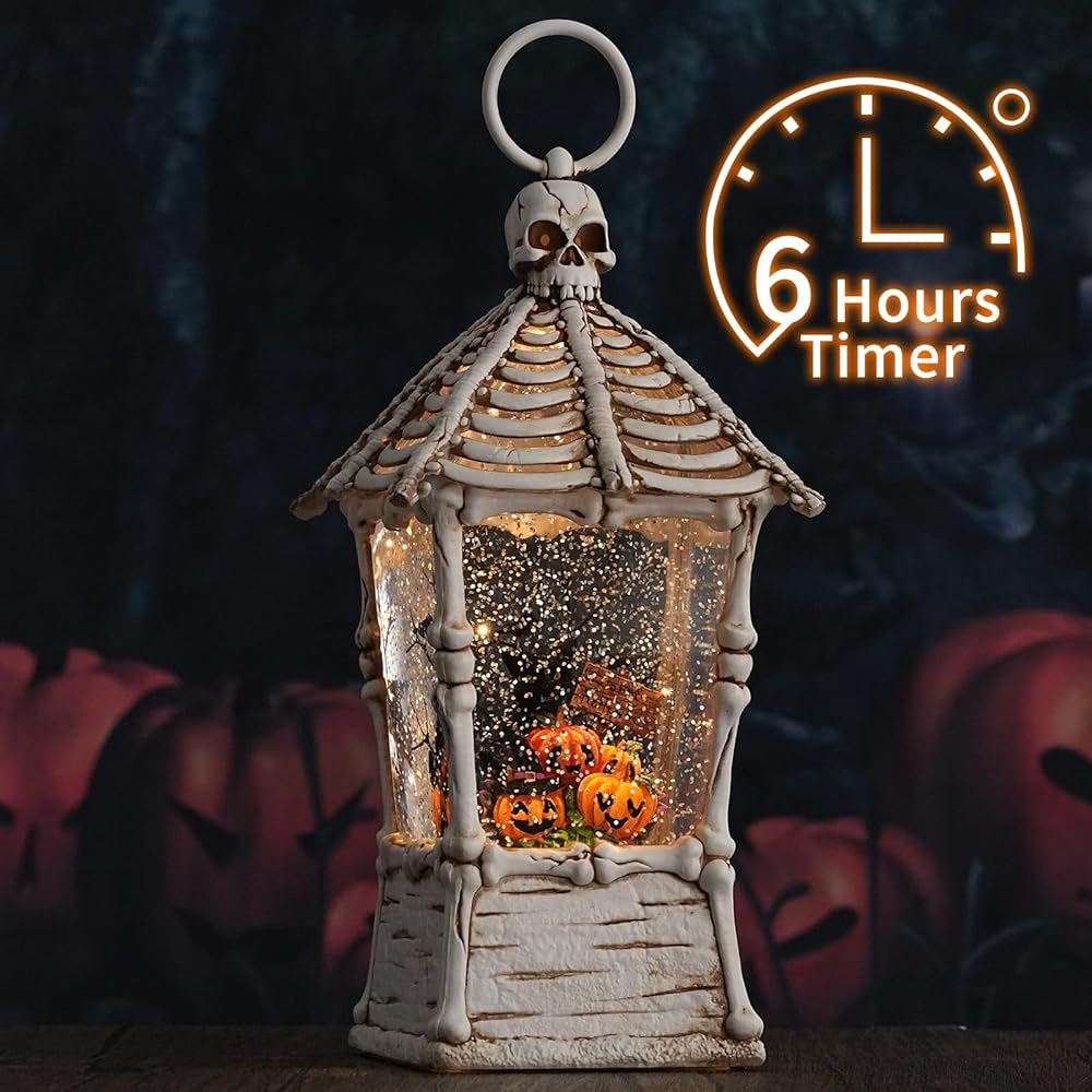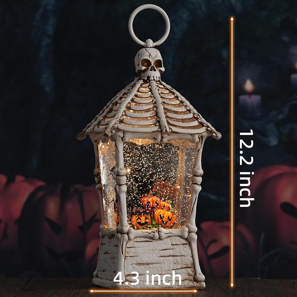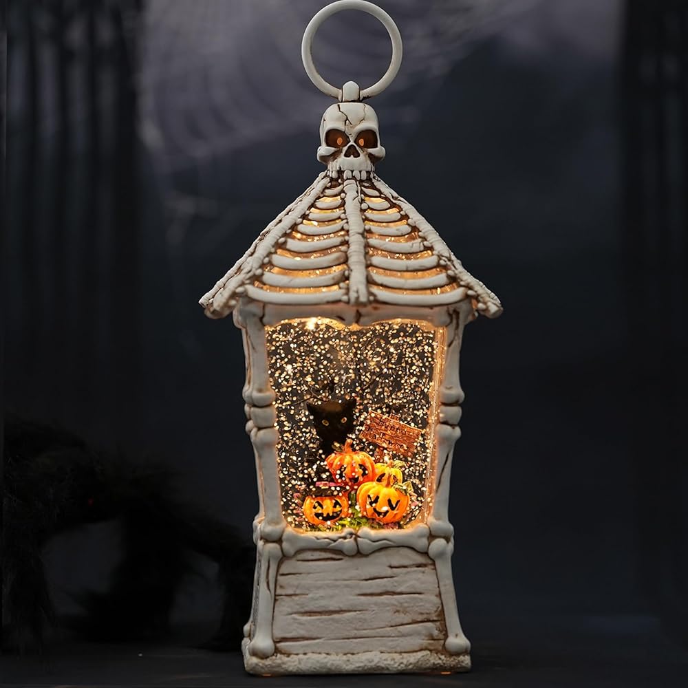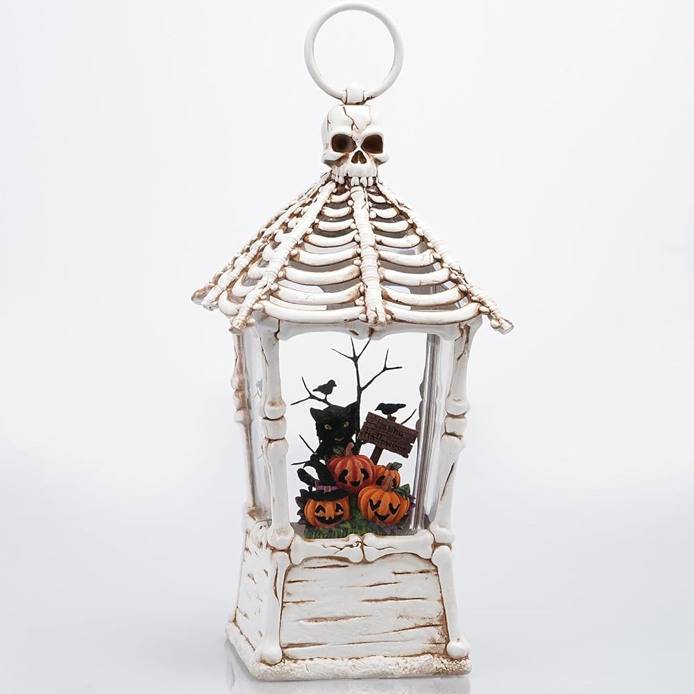 Halloween Scene: Our halloween snow globe lantern is styled with a white skeleton and haunted house combination as a shell, with a black cat standing on pumpkins, surrounded by tombstones, bleak trees and crows. All of this makes up an spooky scenes for halloween home decor.