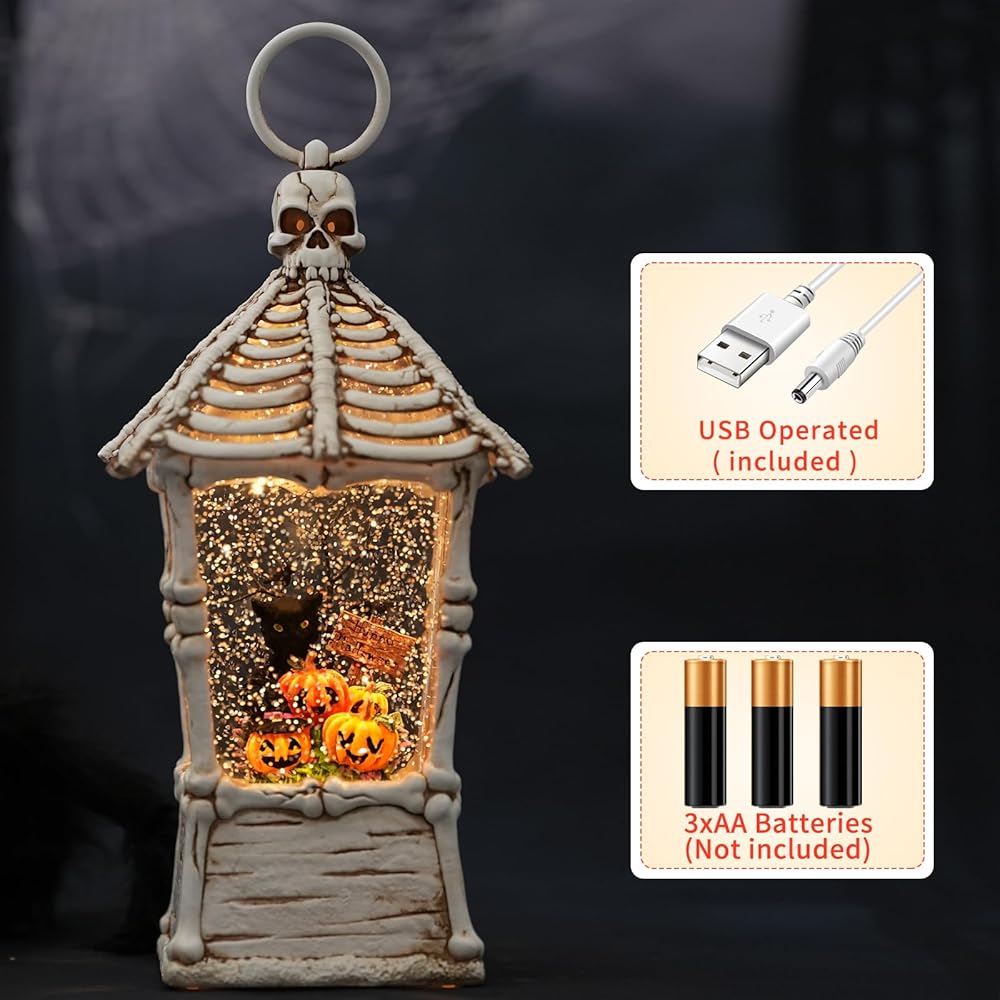 2 Charging Options Available: The halloween indoor decorative snow globe lanterns comes with a usb cable and the snow globe light can work without batteries. It can also be powered by 3 AA batteries (batteries not included). Perfect for carrying, no need to worry about the power supply of the halloween lights!
