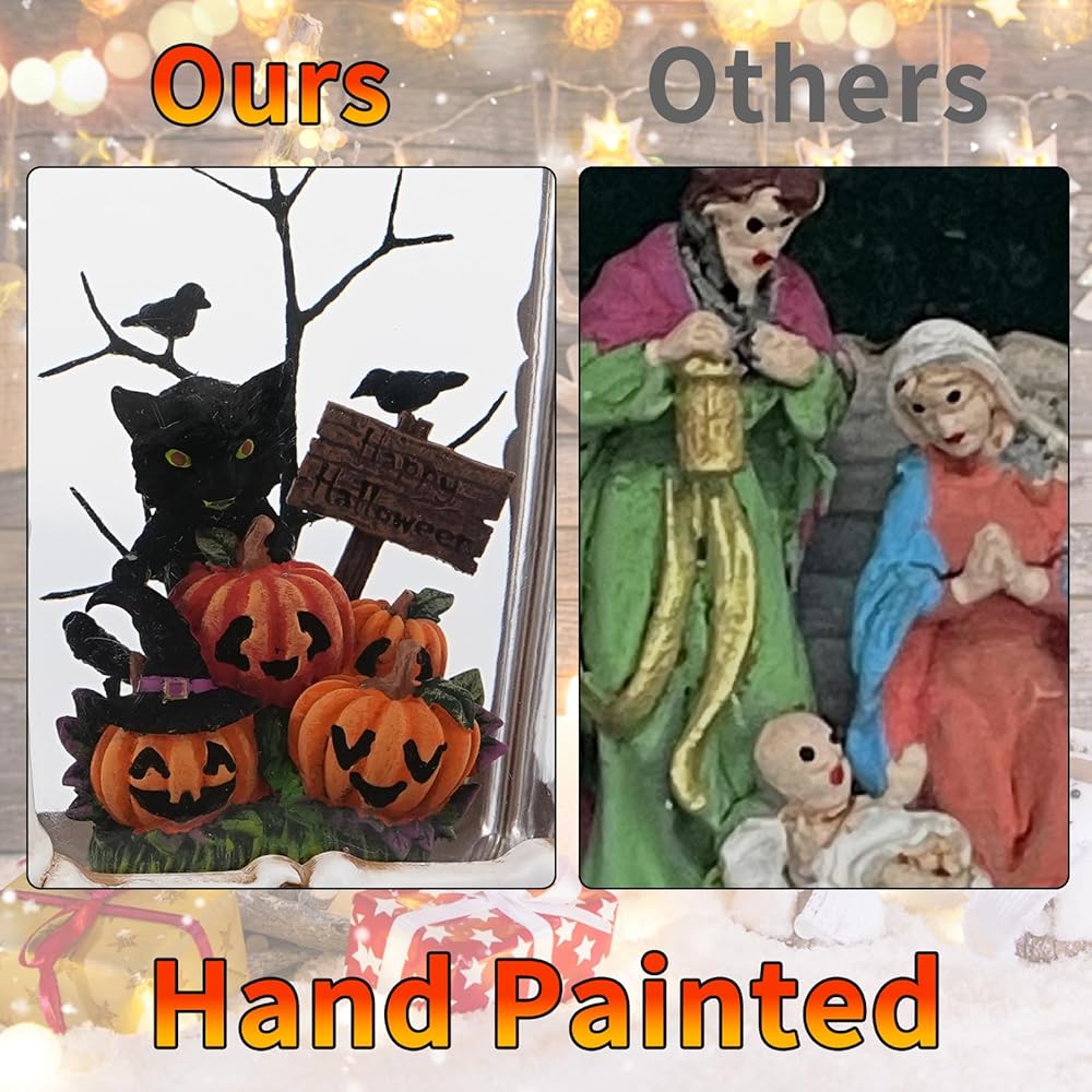 6 Hour Timing: The glowing black cat lantern comes with 6h timer function. The snow globe candle lights up for 6 hours, goes out for 18 hours, then automatically goes out for 18 hours, cycling every day. It can also be used as a night light, don't worry about forgetting to turn off the light.