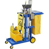 INTEGRATED HOLDERS: On the sides of the cart, you'll find dedicated pole handle notches, perfect for securely holding items like brooms and mops. At the front, specialized hooks are present for conveniently hanging caution signs. This design ensures that all essential items are easily accessible and well-organized.