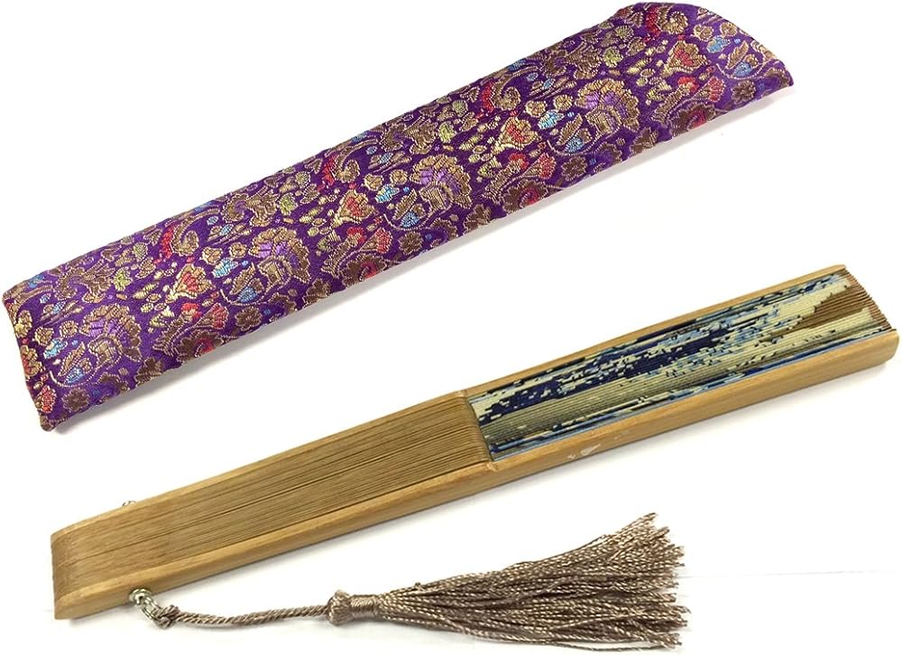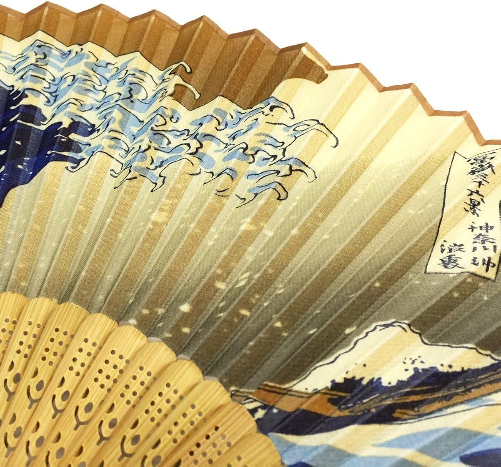 Ward off the summer heat and insects with these lovely fans. Light and compact, these fans can be easily folded and put into your purse when not in use. Each fan features an artistic image of Hokusai's the great Wave; place them on a stand for decorative purposes, use them for weddings, or give them away as gifts. Handmade and therefore each fan may be slightly different. Comes with a Tassel and a protective silk sleeve.