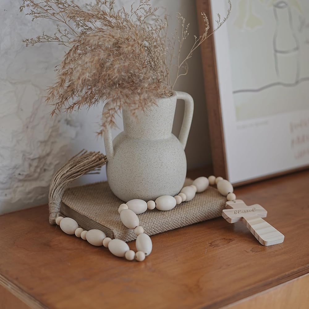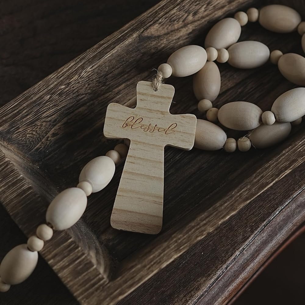 FAITH: Wooden Beads Garland with Blessed Cross brings hope, peace and blessing into your home. The beaded garland is exquisite home décor accents for shelf decor, coffee table decor, fireplace mantle decor, and entryway decor
