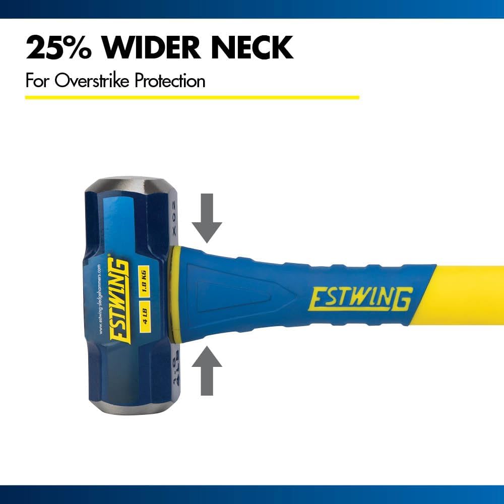 Drive stakes and rebar, shatter stone and concrete, and perform heavy demolition or industrial construction projects with the hard hitting power of this Estwing sledge hammer. Designed and built for heavy-duty use, this hammer features a 4 lb. forged alloy steel head with striking ends hardened to 50-55 HRC to withstand years of repeated impacts without deforming. This head is mounted to a 16-inch long, fiberglass handle that is double injected for increased strength and durability. A textured rubber overlay on the handle provides a comfortable, ergonomic, and secure grip in both grip positions while also helping to dampen vibrations. Below the striking head the handle and rubber overlay are thicker to provide increased overstrike protection to prevent damage from missed hits.