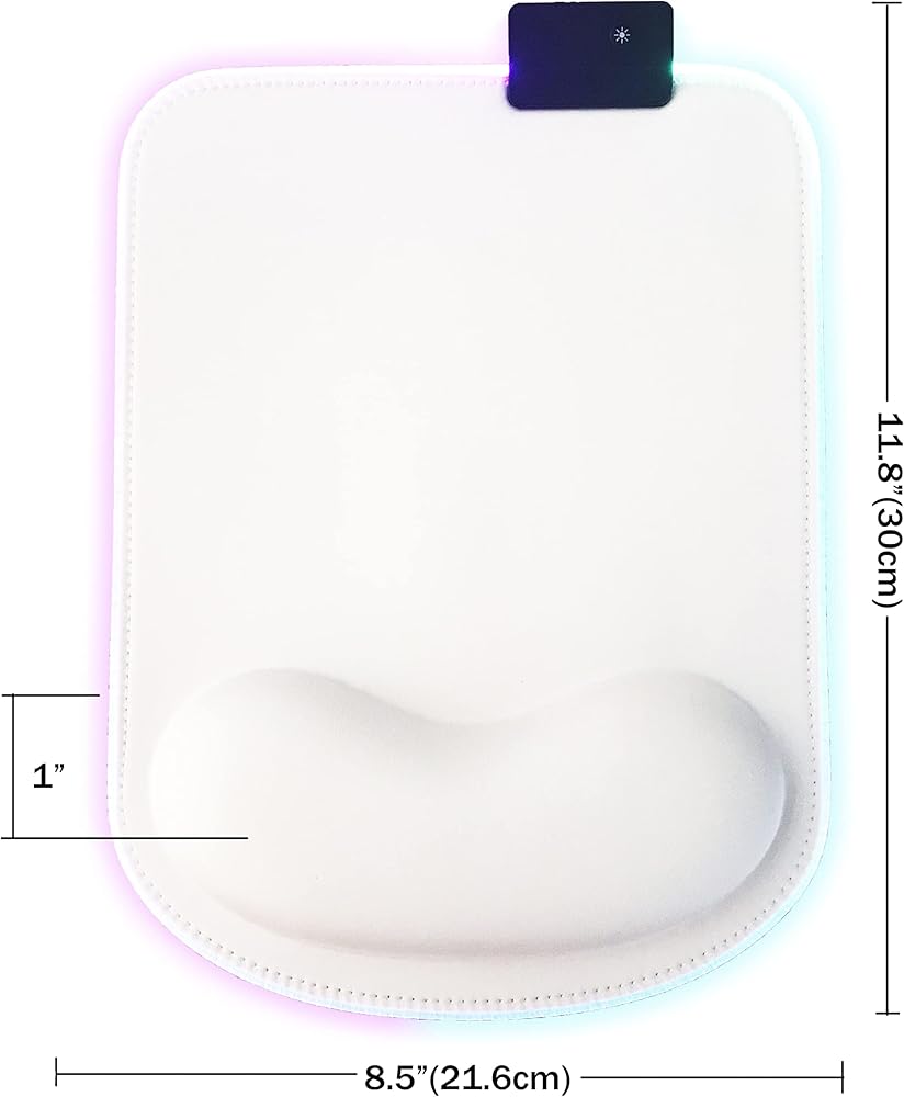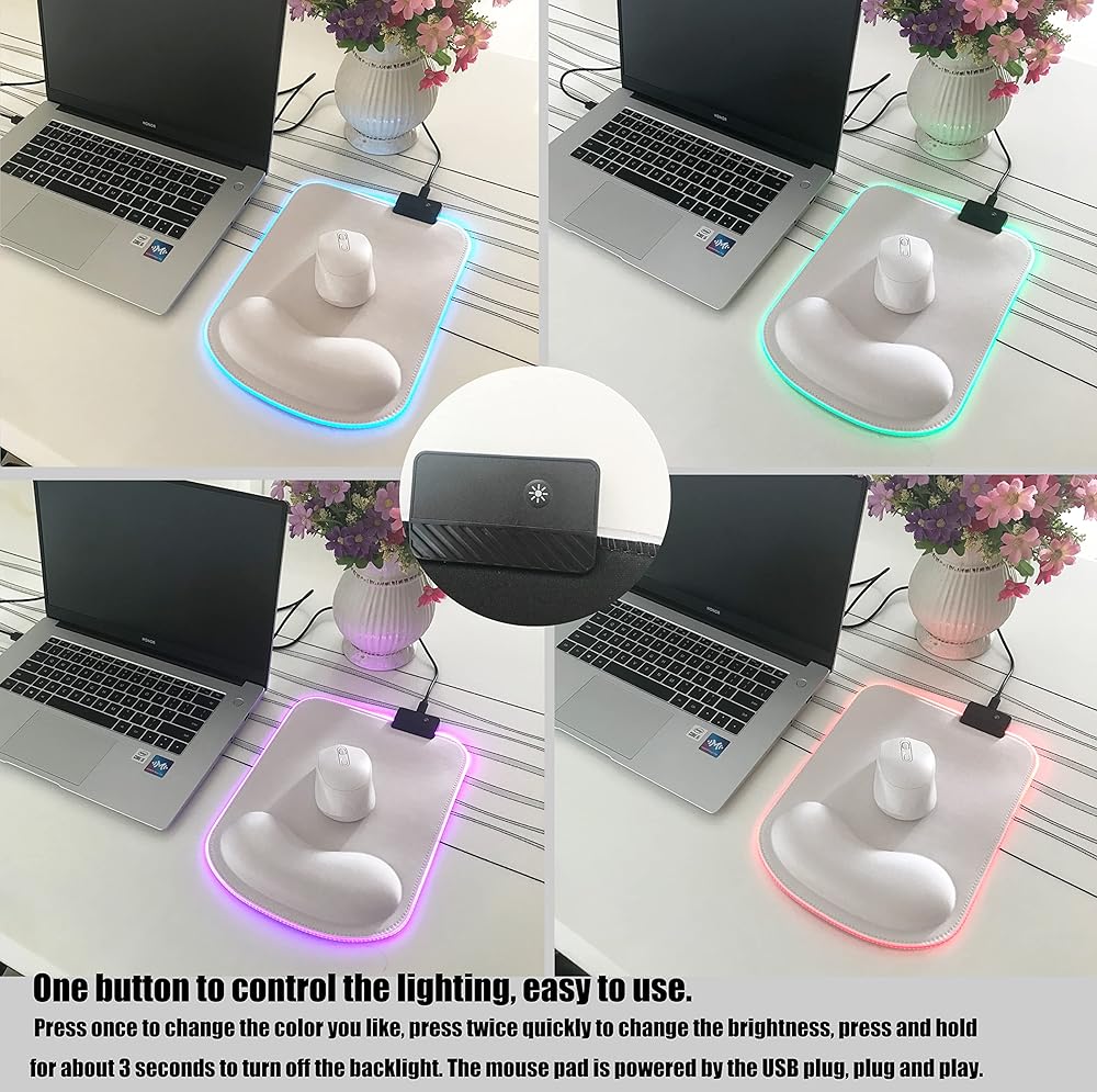 RGB LED Wrist Support Mouse Pad with 13 Lighting Modes, Anti-Slip Rubber Base, Pain Relief Ergonomic Gaming/Office/Home Mouse Pad, 11.8 x 8.5 in (White)