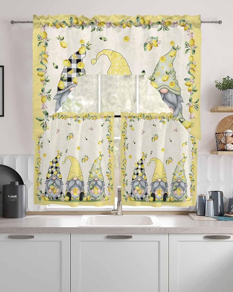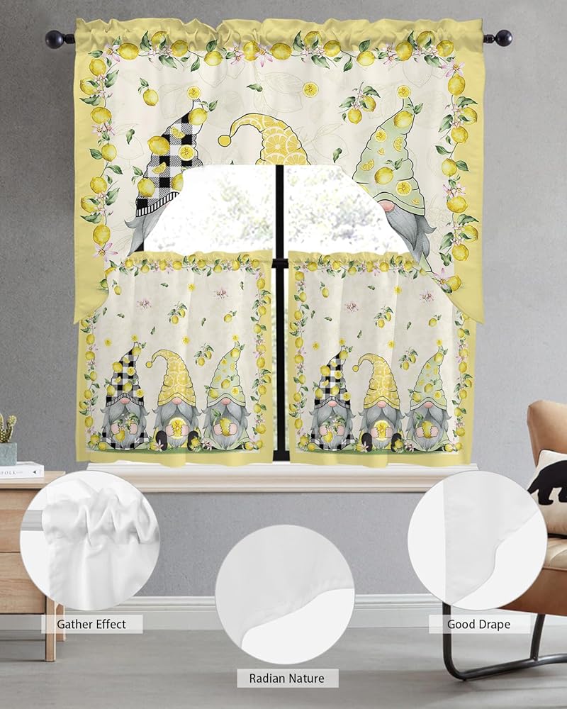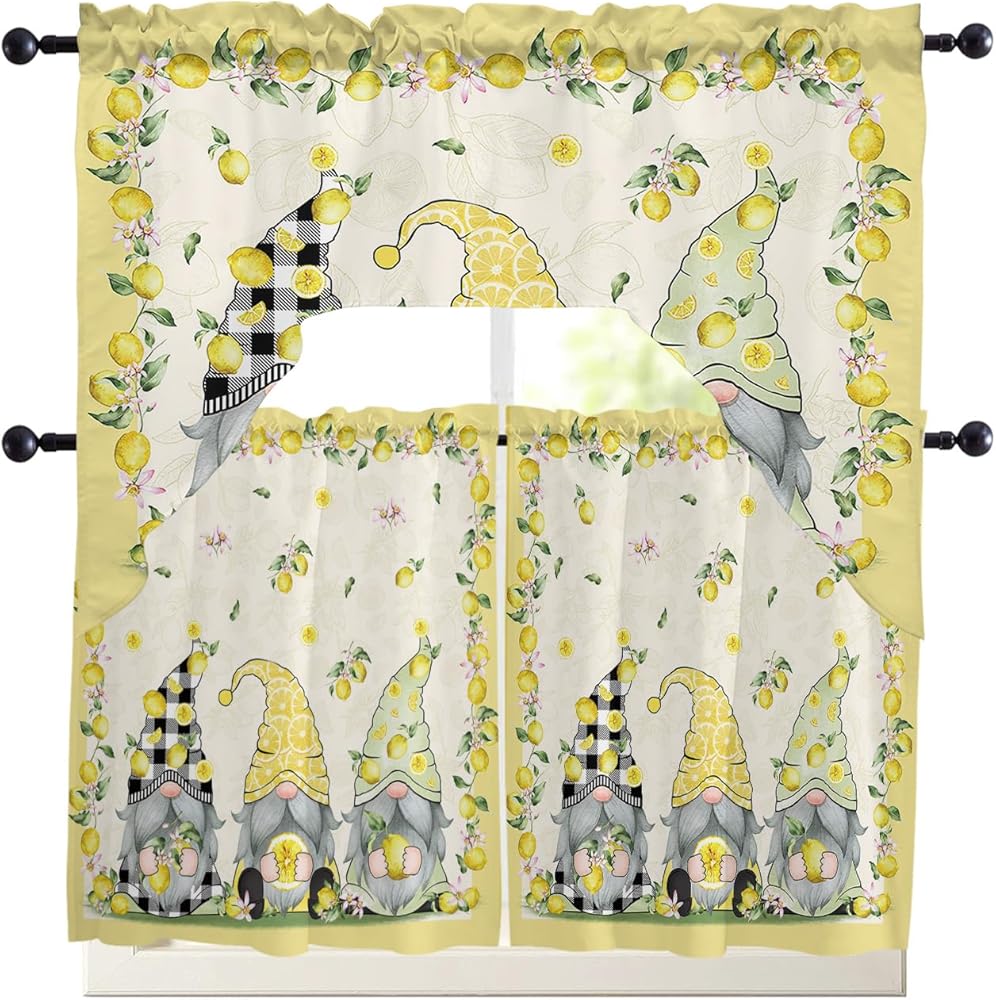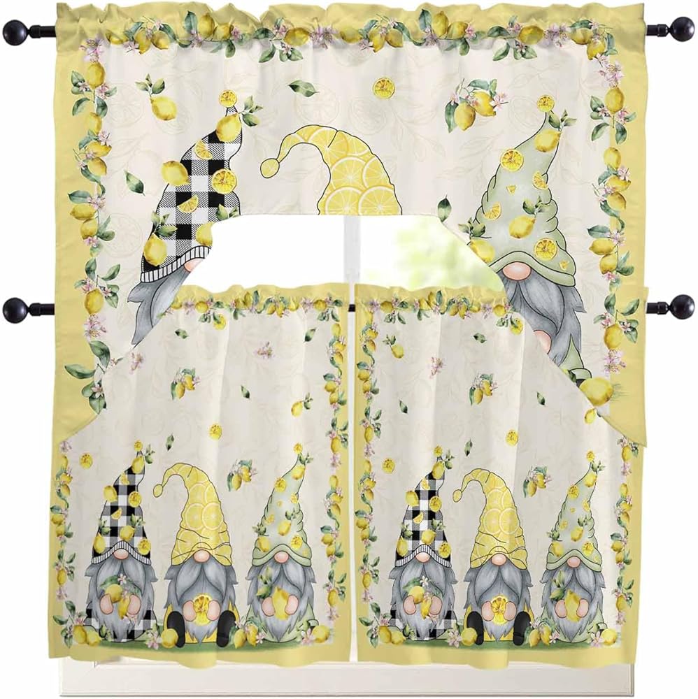 Summer Gnomes Lemon Swag Kitchen Curtain Sets with Valance,3 Pieces Rod Pocket Curtain Drapes for Bedroom Bathroom Cafe Windows,Spring Yellow Black White Plaid 56''x36''&36''x27.5''x2Panels