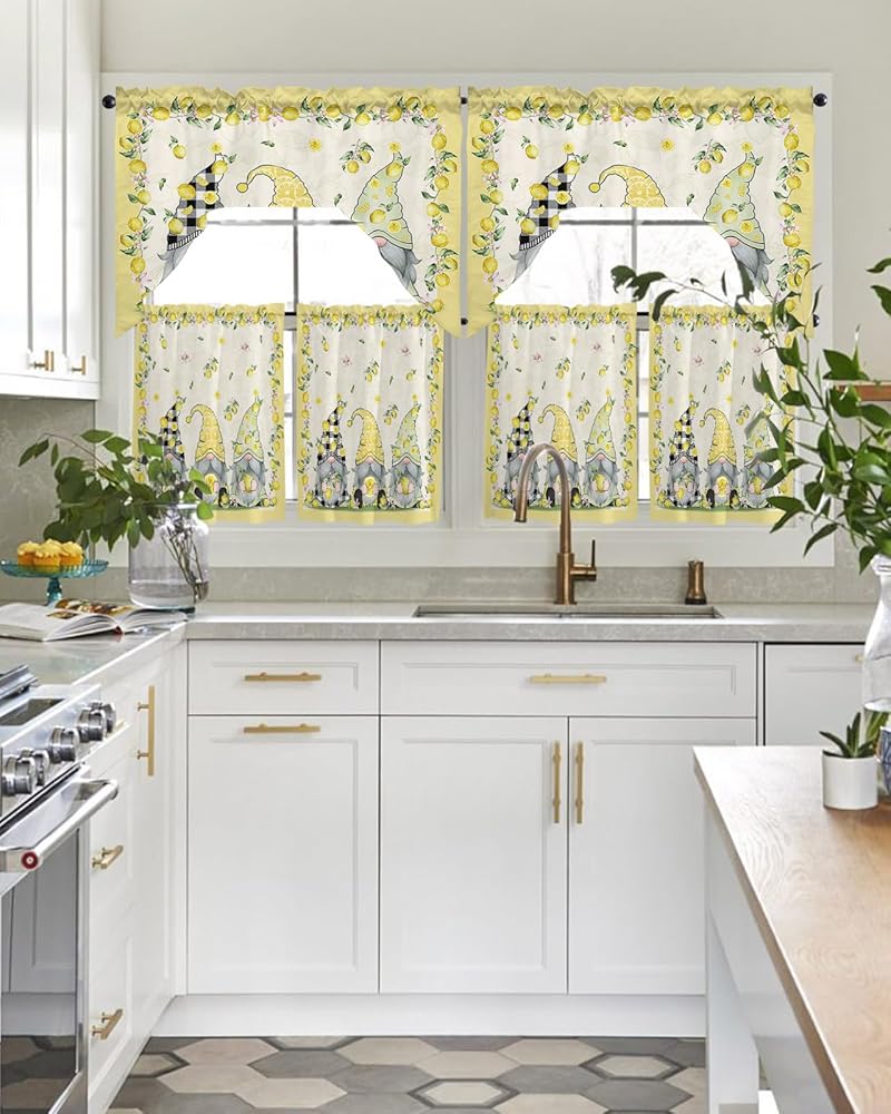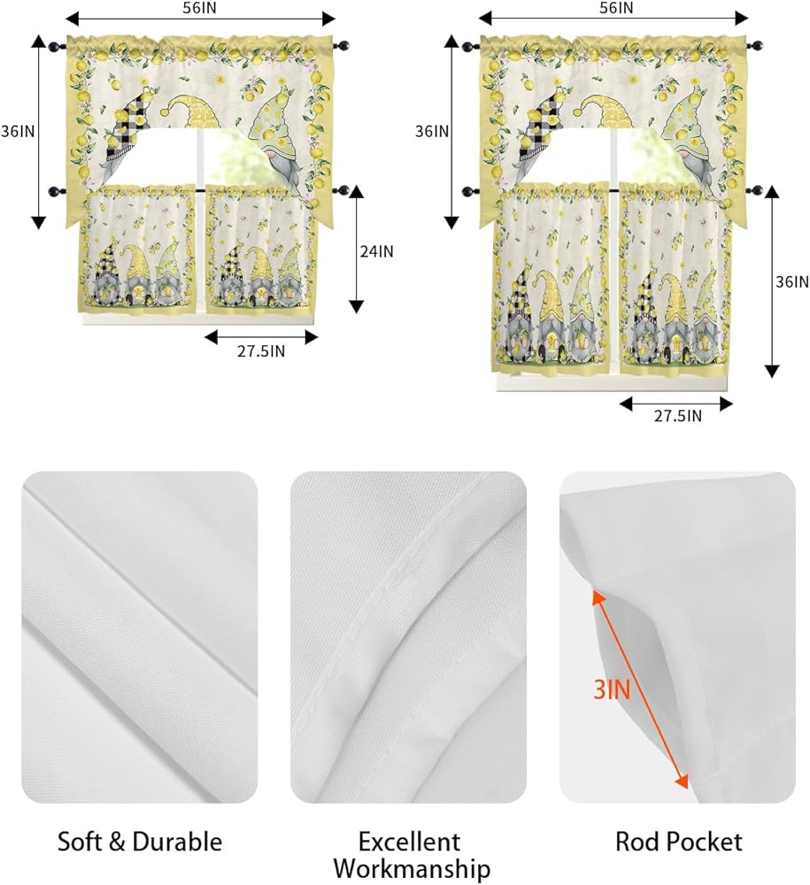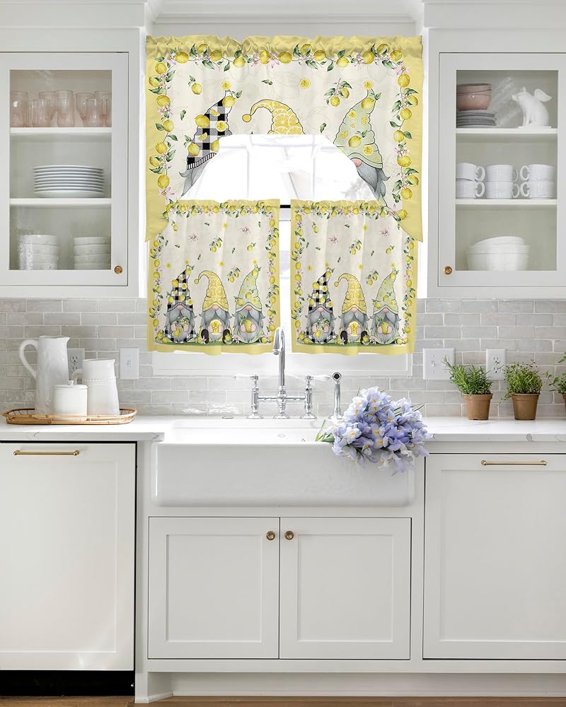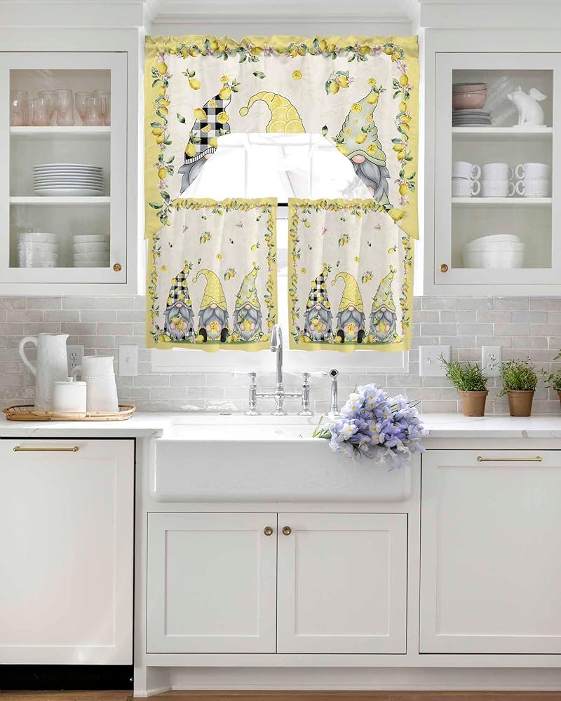 Summer Gnomes Lemon Swag Kitchen Curtain Sets with Valance,3 Pieces Rod Pocket Curtain Drapes for Bedroom Bathroom Cafe Windows,Spring Yellow Black White Plaid 56''x36''&36''x27.5''x2Panels