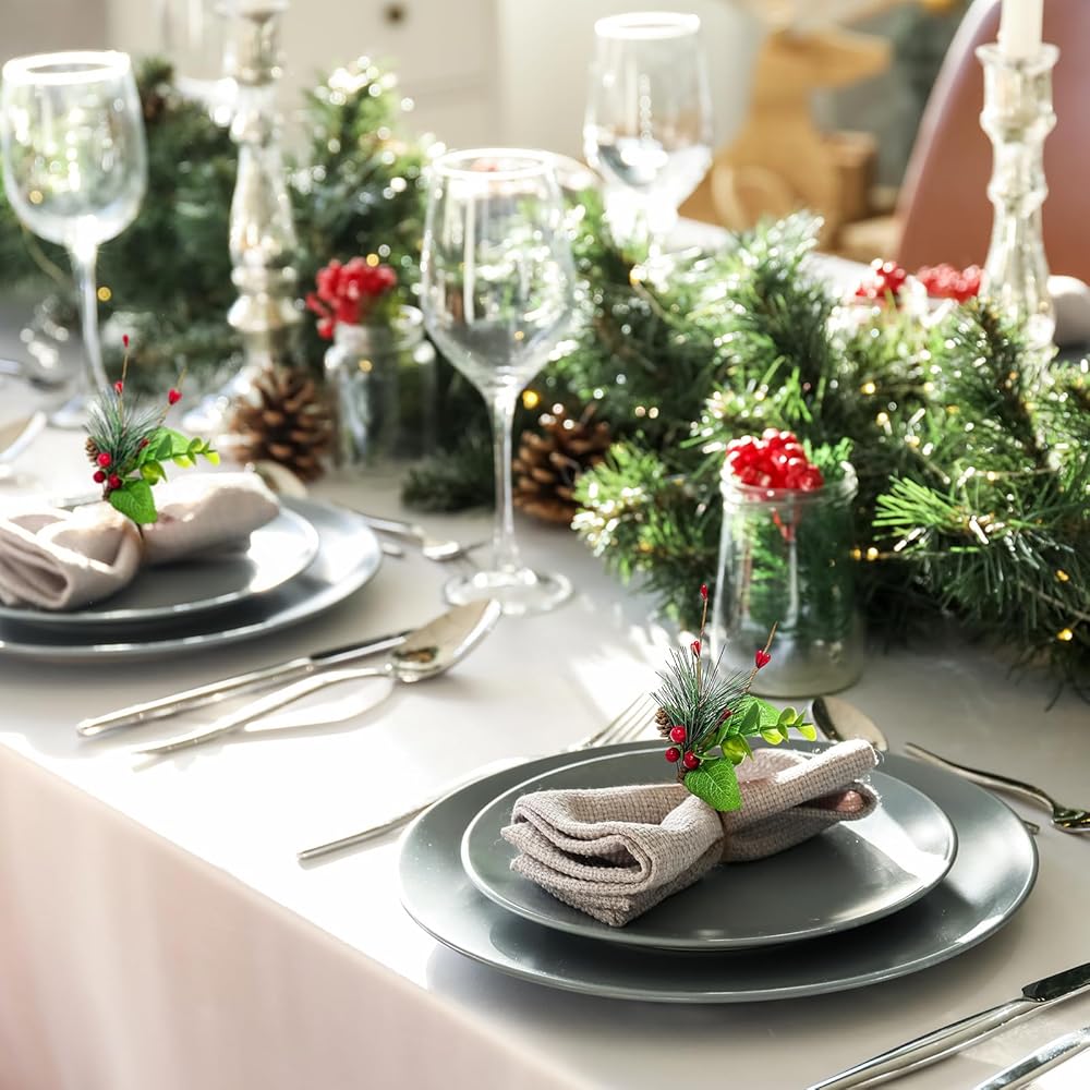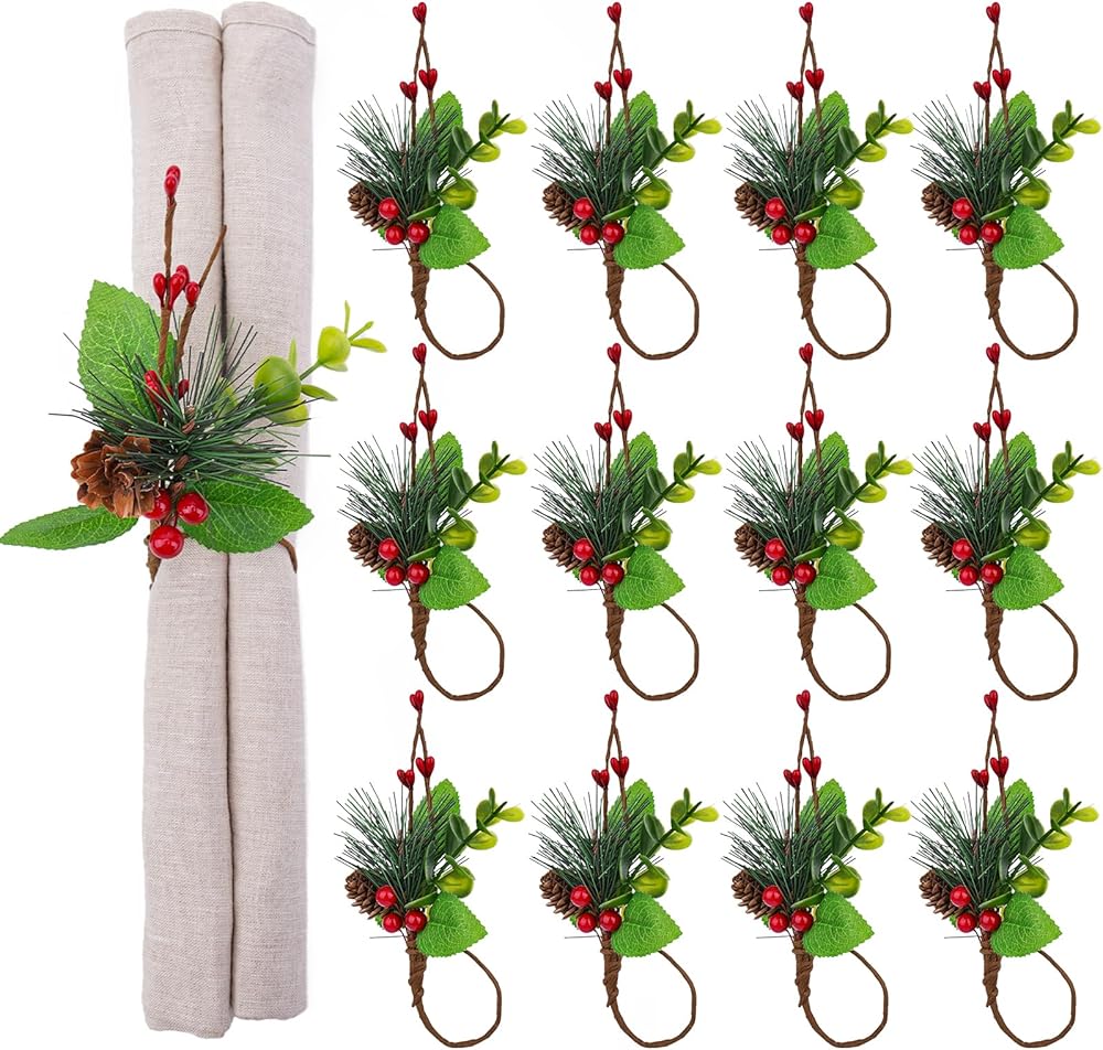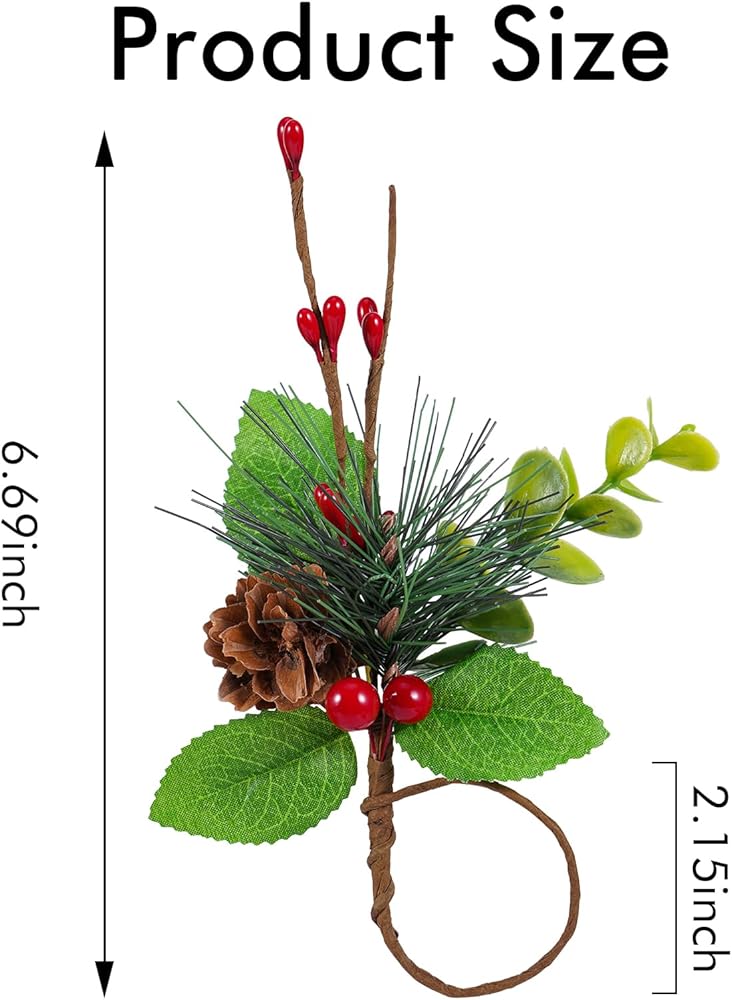 Christmas Napkin Rings Holders - 12PCS Evergreen Snowy Pinecone Napkin Holder Rings with Handmade Red Berry Decor Rustic Napkin Ring for Christmas Thanksgiving New Year Party Dinning Table