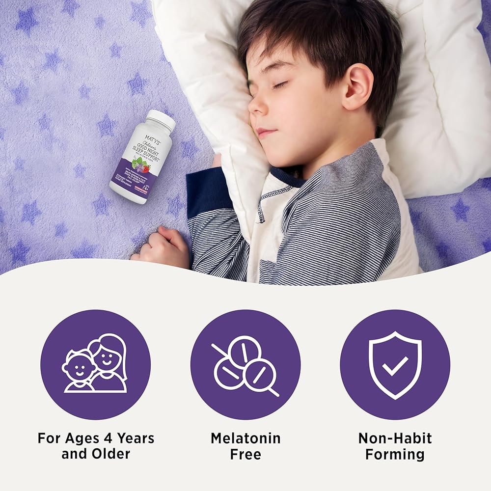 SWEET DREAMS AHEAD: Are they ready for bedtime? Maty's Kids Good Night Sleep Support Chewable Tablet is here to help! With a blend of Saffron, Magnesium, and Lemon Balm, it's like a lullaby in a chewable form. And with No Melatonin, it's perfect for parents seeking a gentle, effective sleep aid solution for their kiddos. We recommend our chewables for Children ages 4 years and older.