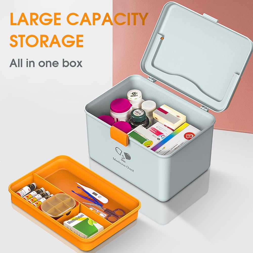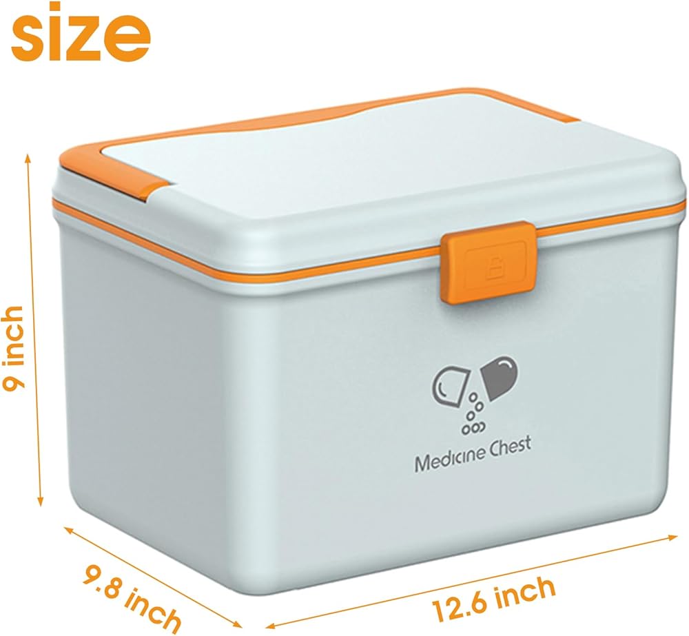LARGE SPACE WITH A REMOVEABLE TRAY: Medium size 12.65*8.77*8.97 inches. Perfect space for your regular medicines. Deep enough for your pill bottles.The removable plastic tray allows you to segregate your medicine into 2 groups, important and non-important.Keep your medicine orgnized, tidy and dry.