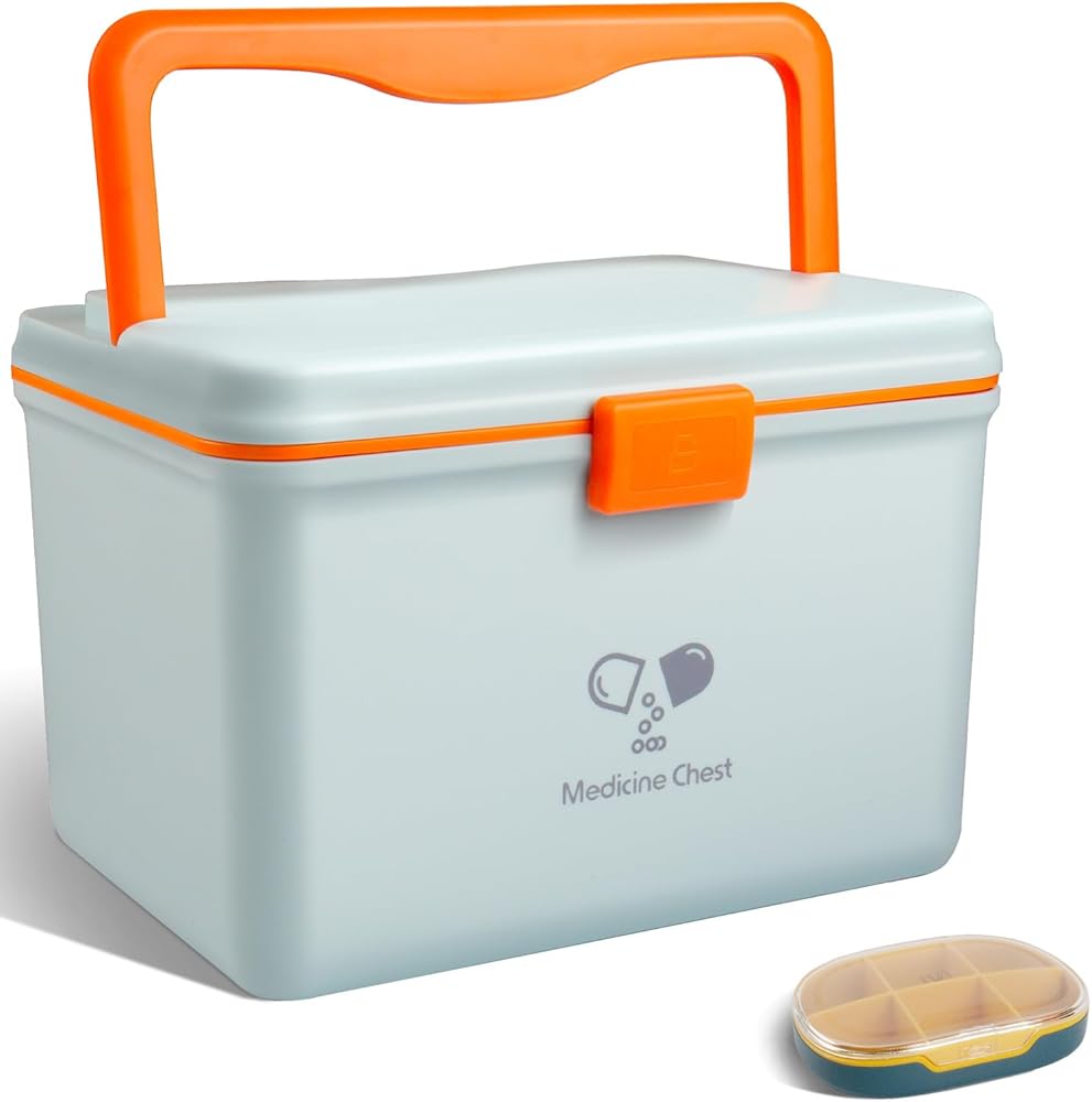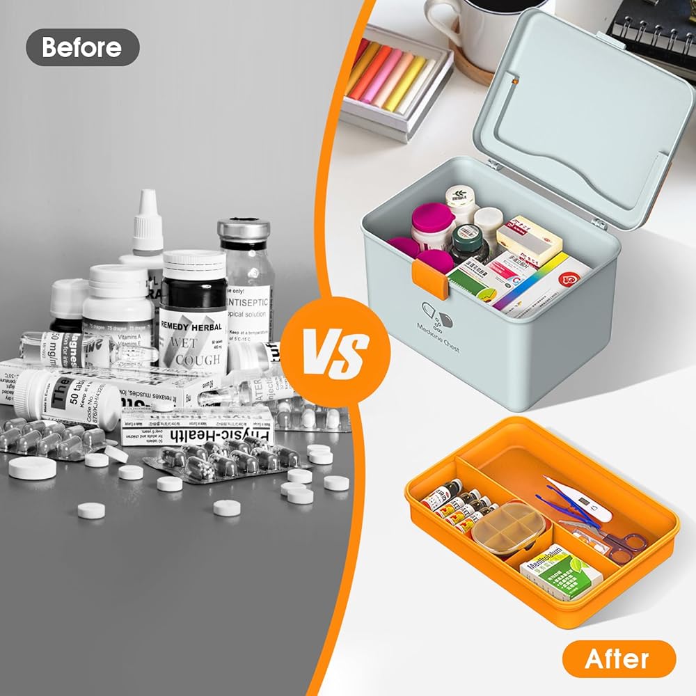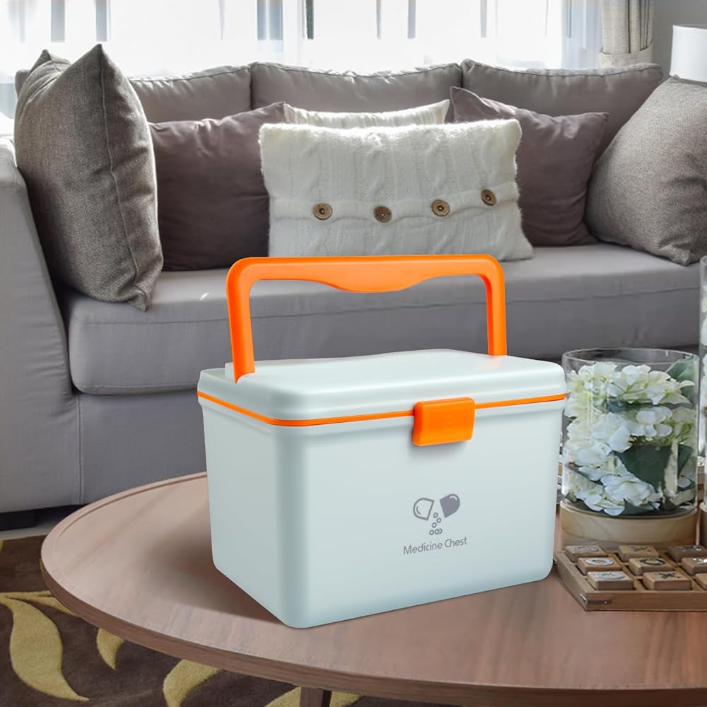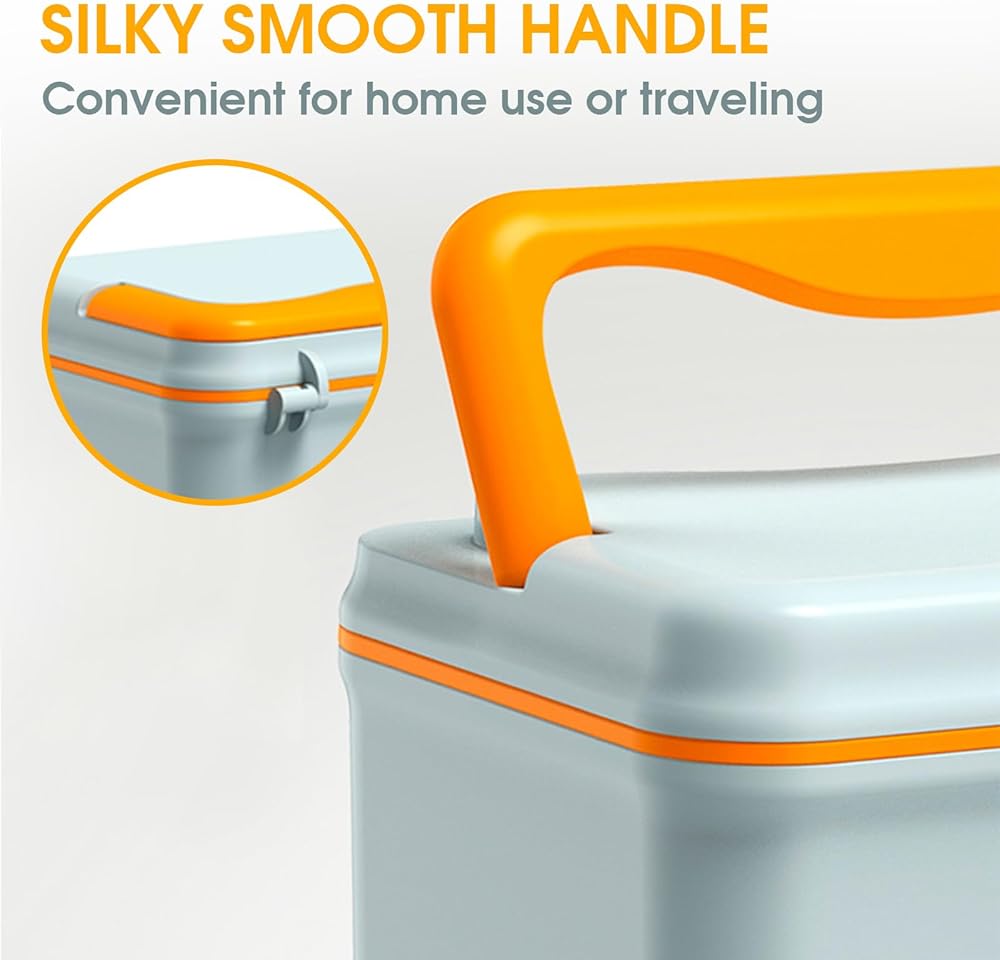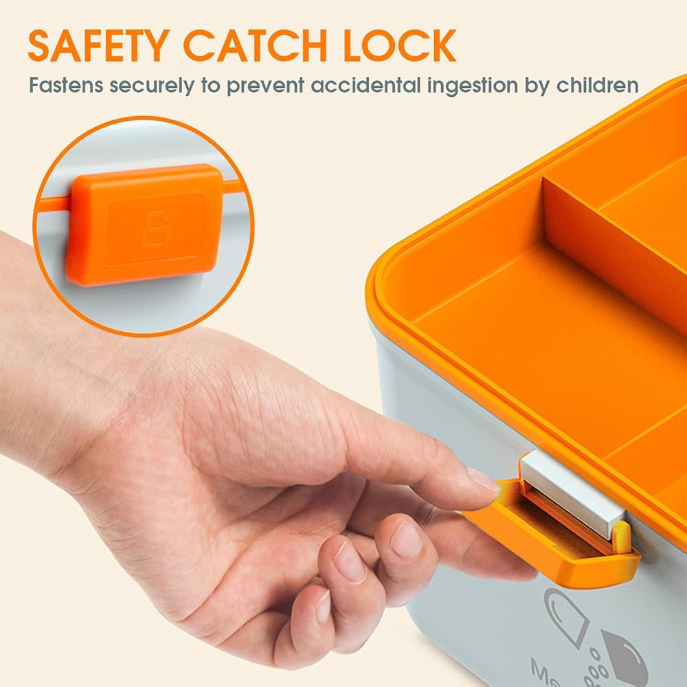 EASY CARRY: Orange-handle on the top allows you to carry it easily. It is convenient for you to take this medicine storage box in your traveling and outside activities.