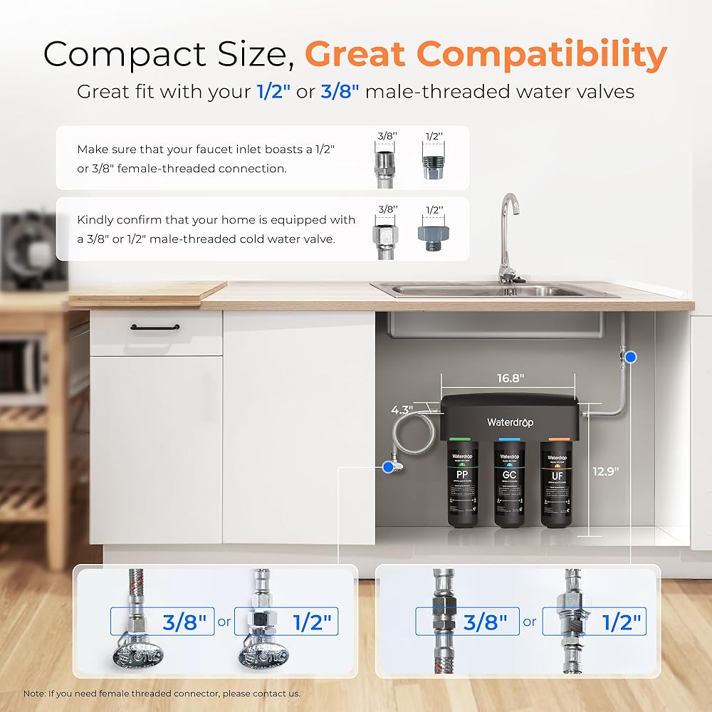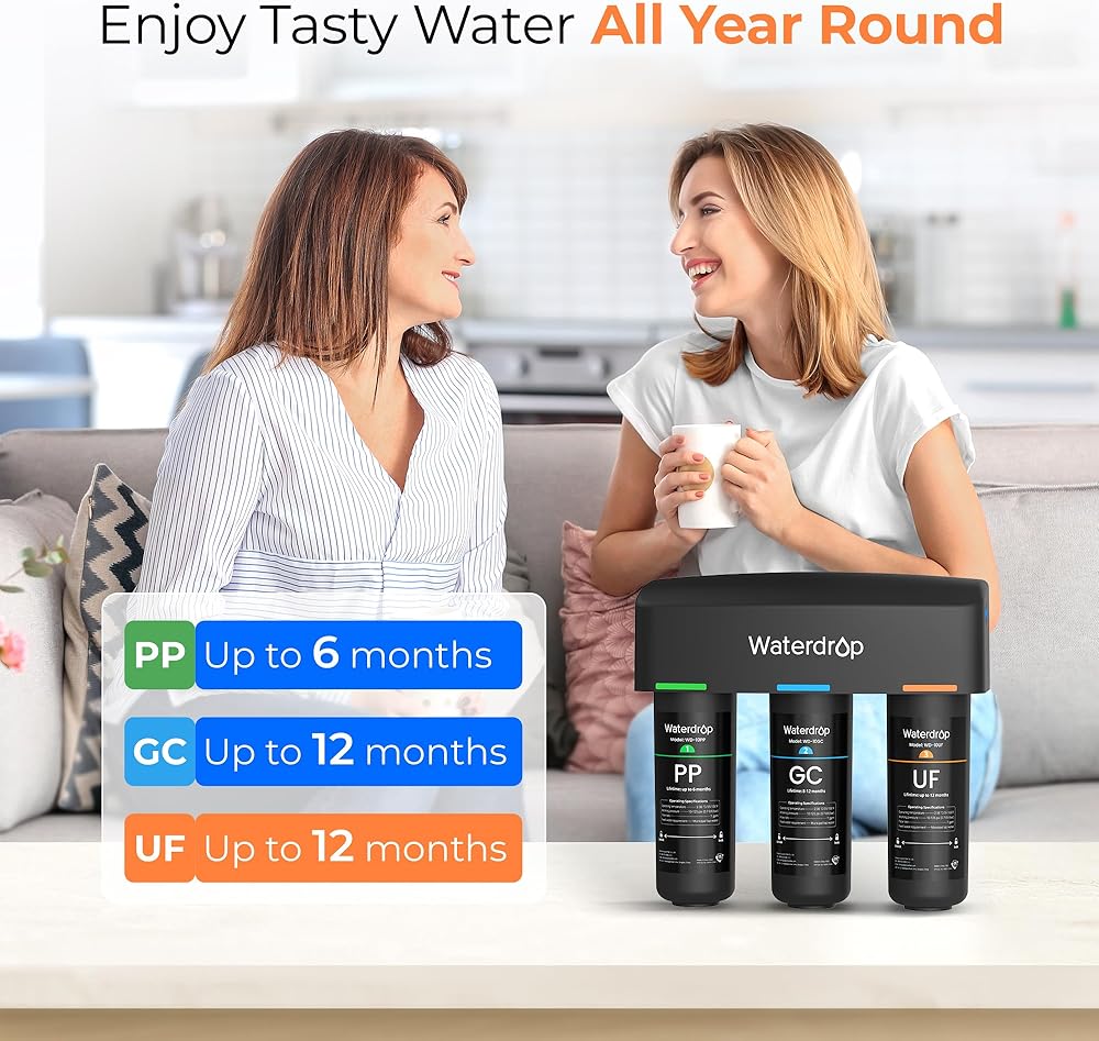 [Long Filter Lifespan] Enjoy pure water all year round. The 3 high-quality filters in this under sink water filter have impressive lifespans. The PP filter can last for up to 6 months, the GC filter can work for 8-12 months while the UF filter can last up to 12 months. This means fewer replacements and more convenience for you. Say goodbye to frequent filter changes and hello to long-lasting, clean water every day.