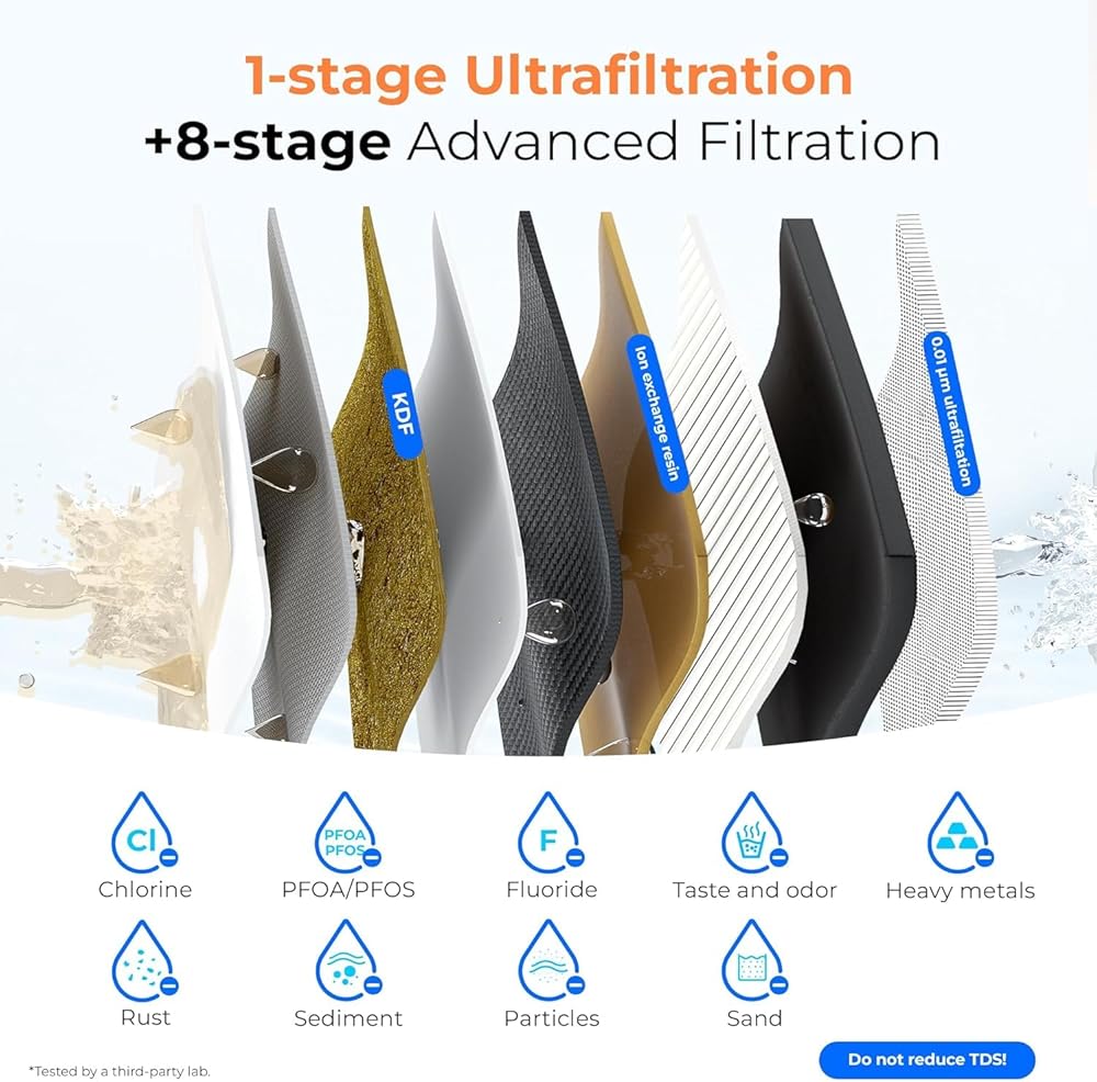 [0.01 μm Ultrafiltration and 8-stage Advanced Filtration] This under sink water filtration system includes 3 filters for 9-stage deep filtration to reduce chlorine, taste and odor, fluorides, heavy metals, rust, sediment, sand and particles, tested by a third-party lab. Its KDF materials reduce heavy metals and harmful substances, ion exchange resin reduces fluorides, and the 0.01 μm ultrafiltration filter can reduce harmful substances that are as small as 0.01 μm and improves taste, ensuring pure, healthy water.