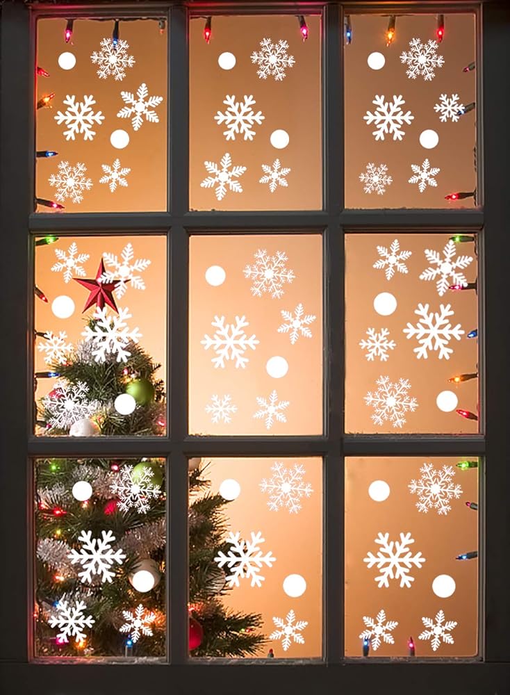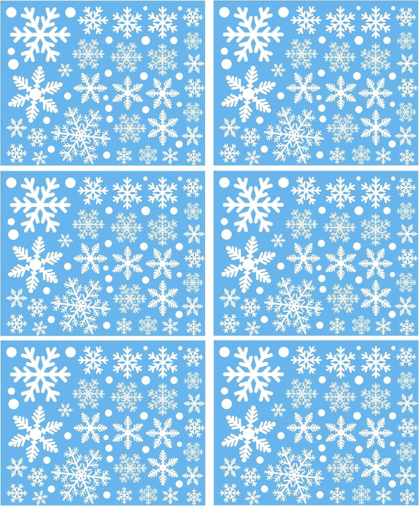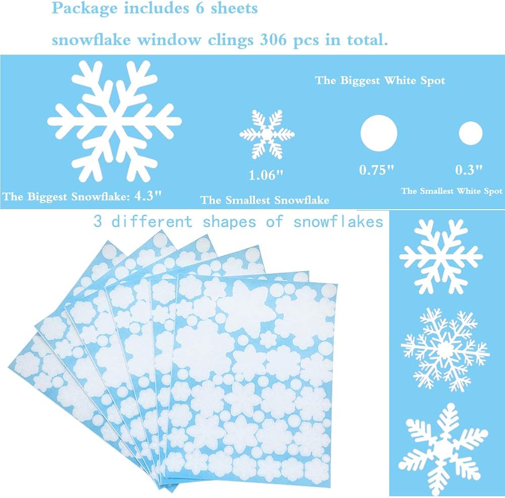 Christmas Snowflakes Decorations Kit Includes:306 pcs in total 174 Snowflakes (in 3 designs)+ 132pcs Dots . 6 sheets Christmas window snowflakes, each sheet measures 14.56inch x 11.8inch.These Christmas snowflake window decorations look really stunning and don't hesitate to buy them for your Christmas party decorations, winter wonderland party supplies.