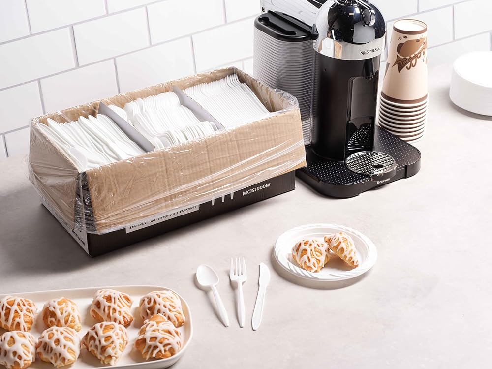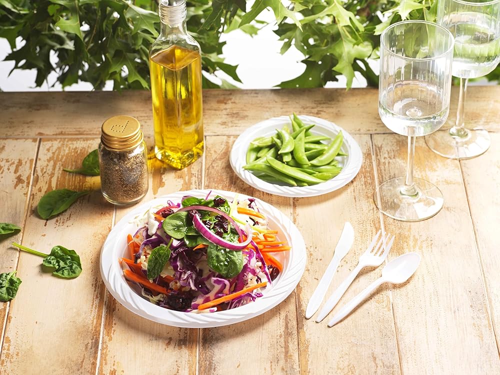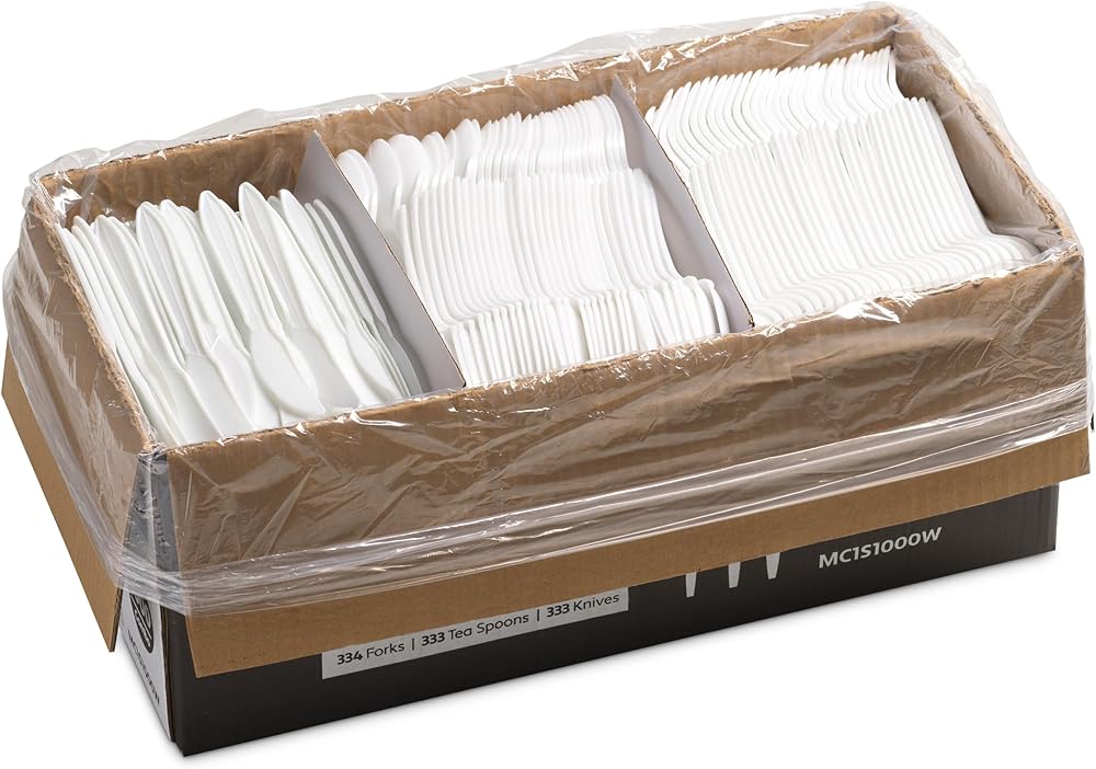 Save your time and energy with this premium quality white plastic disposable silverware set, just toss the disposable cutlery set when you're done, no clean-up necessary! Disposable plastic flatware set ideal for restaurants, schools, weddings, receptions, birthday parties, family events, BBQ'S, picnics, camping, holidays, catered events and all occasions. This bulk disposable flatware set is practical for commercial use, large gatherings and events, office kitchens, meals on the go, picnics, outings, restaurants and takeout. A bulk pack of 1000 white plastic silverware set will last for a very long time with no worries of running out of stock. There are plenty of utensils to accommodate all your guests. Perfect for serving hot or cold food. Indoor or outdoor activities. Made of durable high quality 100% food grade BPA free non-toxic medium weight plastic. Great combo set to serve your family or guests multiple courses. Large silverware set includes: 334 white plastic forks, 333 white plastic spoons, 333 white plastic knives