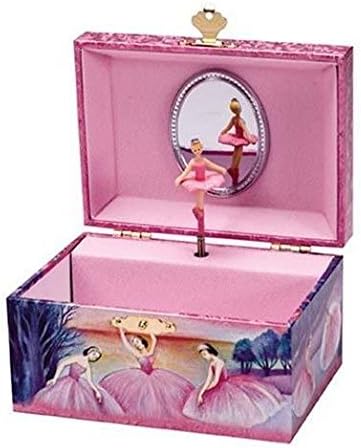 This original Ballerina Jewelry Box features beautiful ballerina graphics, and a shimmery, iridescent finish. It plays "Swan Lake", and has a wind-up key in the back. Ballerina spins to the music when the lid is lifted. Inside is lined in pink, and has a mirror on the lid. Not for children under 3 yrs.