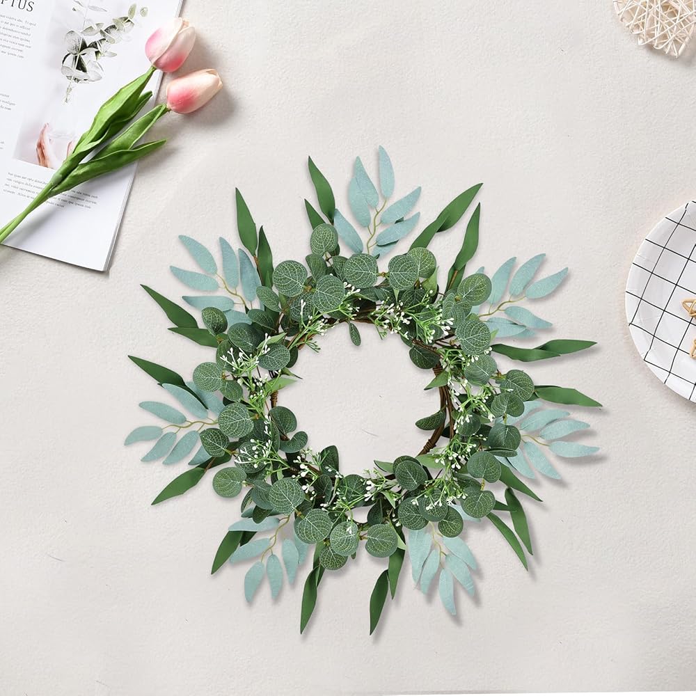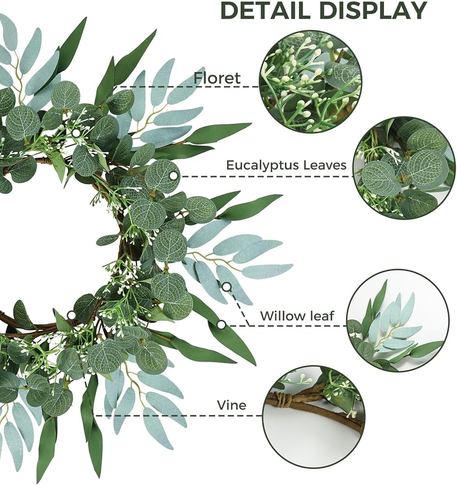 【Handmade】: The artificial eucalyptus wreath is handmade. The eucalyptus leaves are made of silk cloth, the willow leaves are made of EVA, and the white flowers are made of PE. The eucalyptus leaves and clusters of white flowers are fixed on the wire ring. It looks very realistic and eye-catching