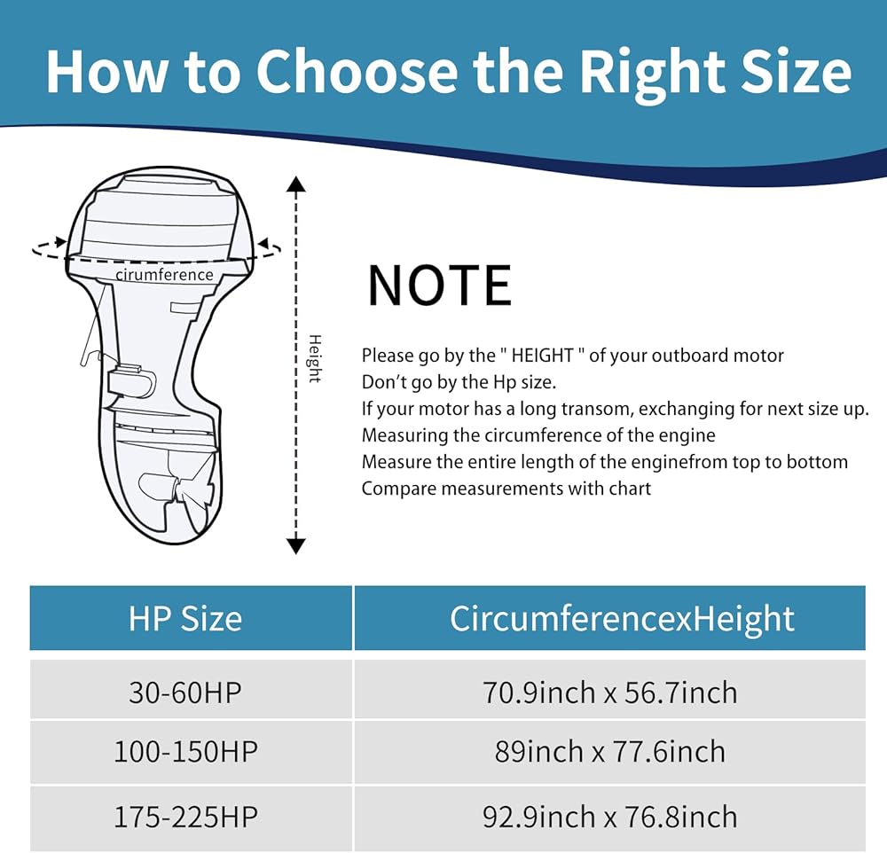 [Product Dimensions] -Our outboard engine covers are available in 3 sizes to fit engines from 30-60HP, 100-150HP and 175-225HP.Ensures a perfect fit with most popular brands on the market including Mercury, Yamaha, Honda, Suzuki, Jet and Nissan.