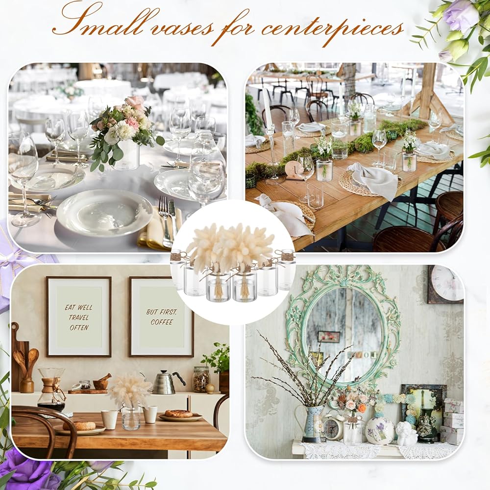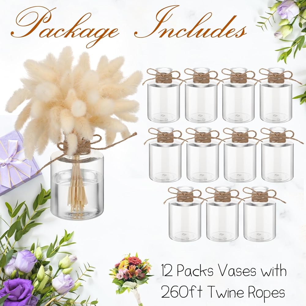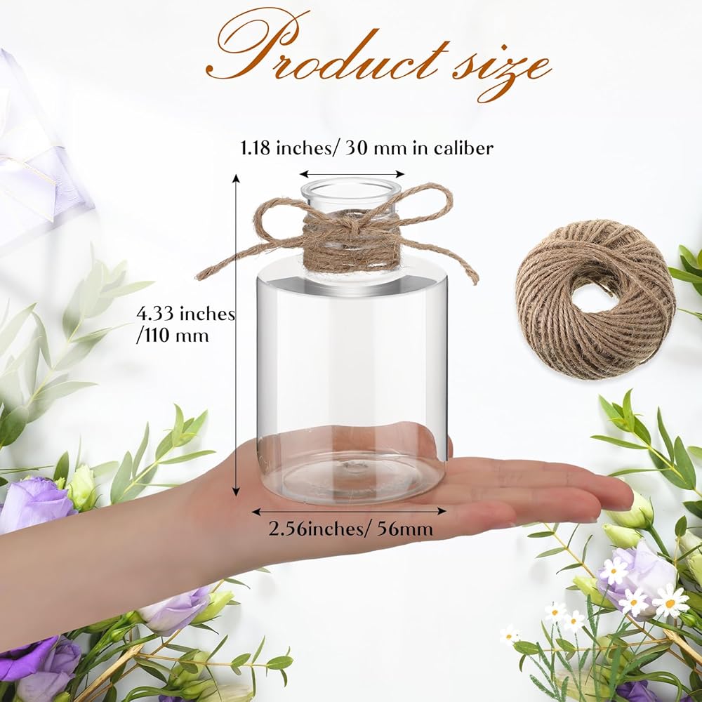 Features: With a lovely and novel shape, you can display our plastic bud vases in your bedroom, bathroom, kitchen, office and more, leaving deep memories for your friends and guests. You can decorate this rope on the cute flower vase, which can match well with your various styles and ornaments, to give you a comfortable and relaxed touch. Specifications: Material: plastic Color: clear Size: about 2.36 x 2.36 x 4.72 inches/ 6 x 6 x 12 cm, 1.18 inches/ 3 cm in caliberPackage includes: 12 x Wedding vases centerpieces1 x Rope (roll)Notes: Manual measurement, please allow slight errors on size. The color may exist a slight difference due to different screen displays.