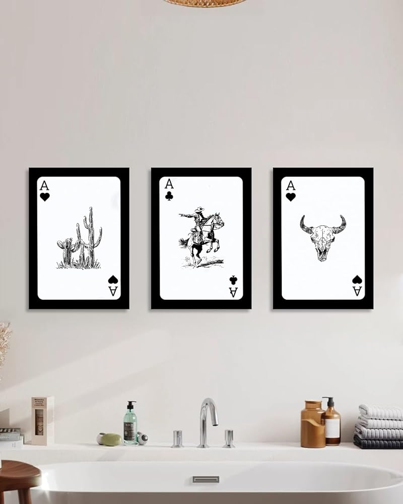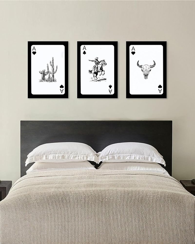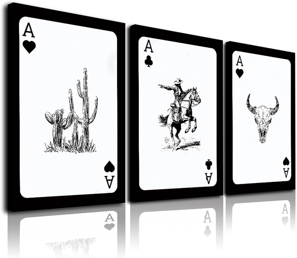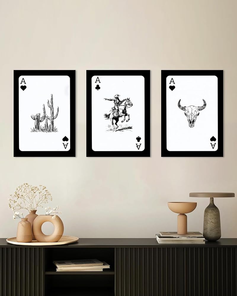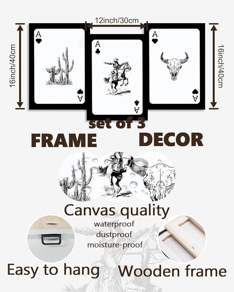 Western Cowboy Wall Art Set of 3, Bull Skull Cowboy Rodeo Cactus Playing Ace Card Vintage Western Room Decor, Southwestern Canvas Art Print, Retro Black & White Pictures for Bedroom Living Room Framed 12x16 Inch