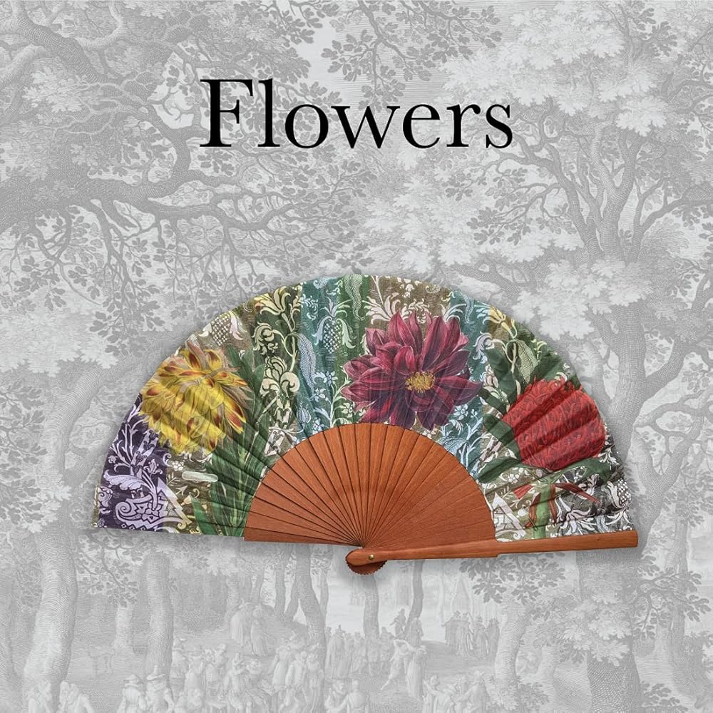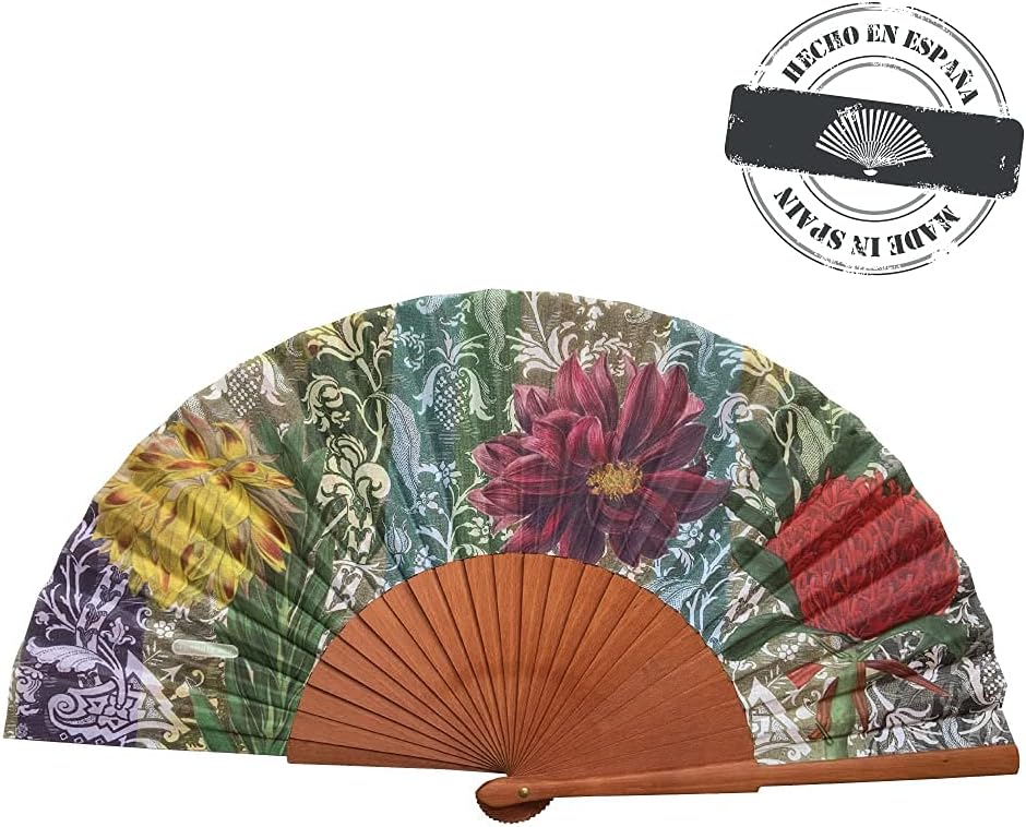 Flowers Hand Fan | Handcrafted Spanish Hand Fan | Cotton Fabric and Wood | Includes Protective Jute Cotton Bag | Authentic Gift | 23cm - 9".