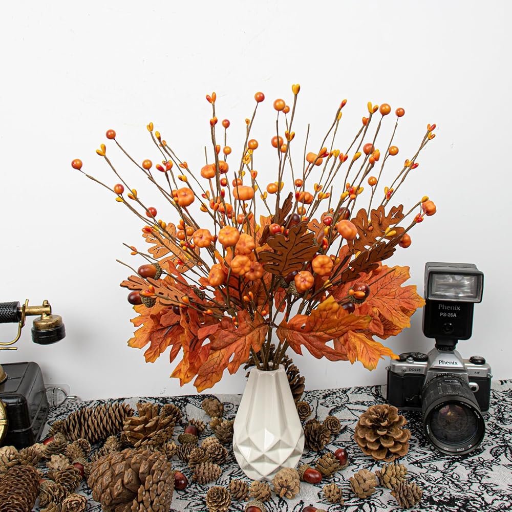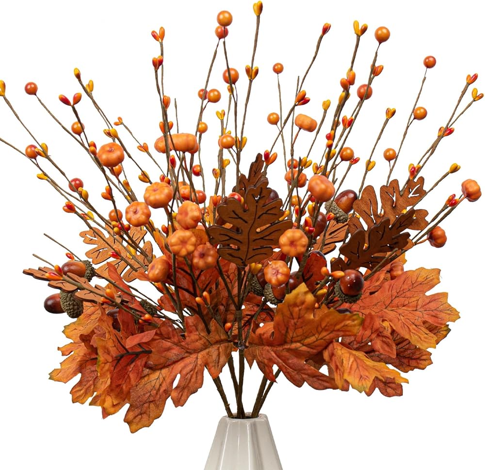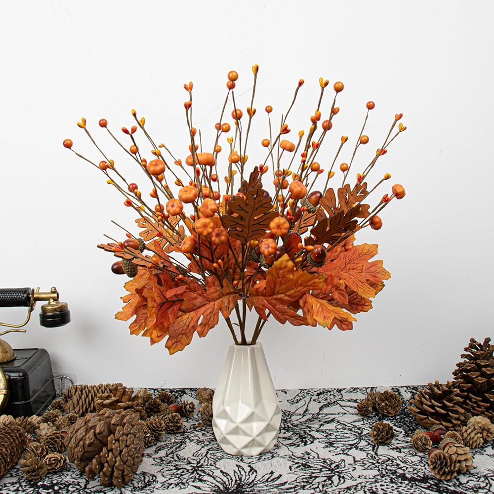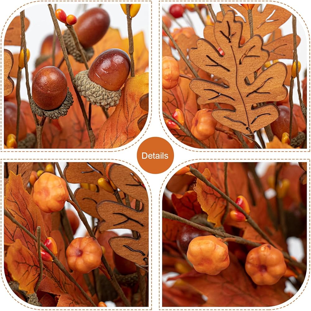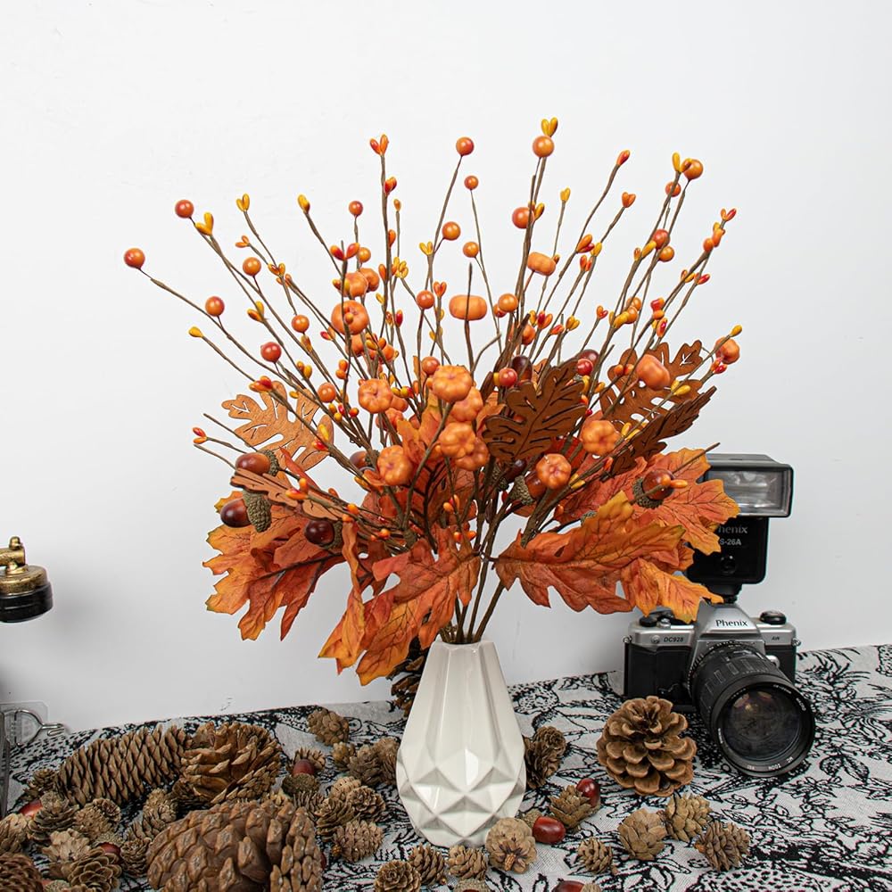 8 PCS 17 Inch Fall Maple Leaves Stems Artificial Fall Picks Autumn Berry Stems with Pumpkins Acorns for Thanksgiving Day Harvest Festival Home Indoor Decorations