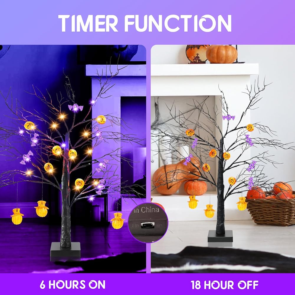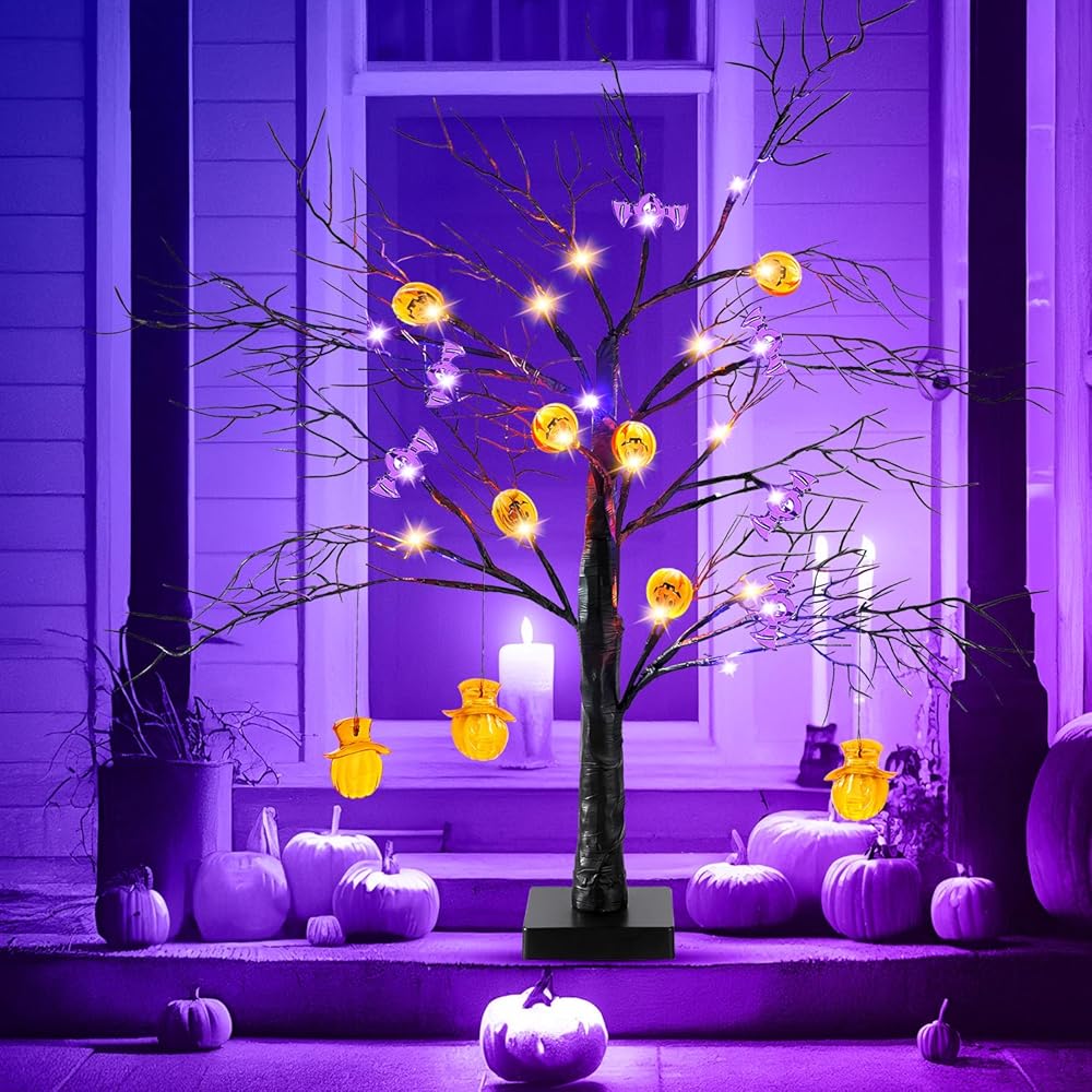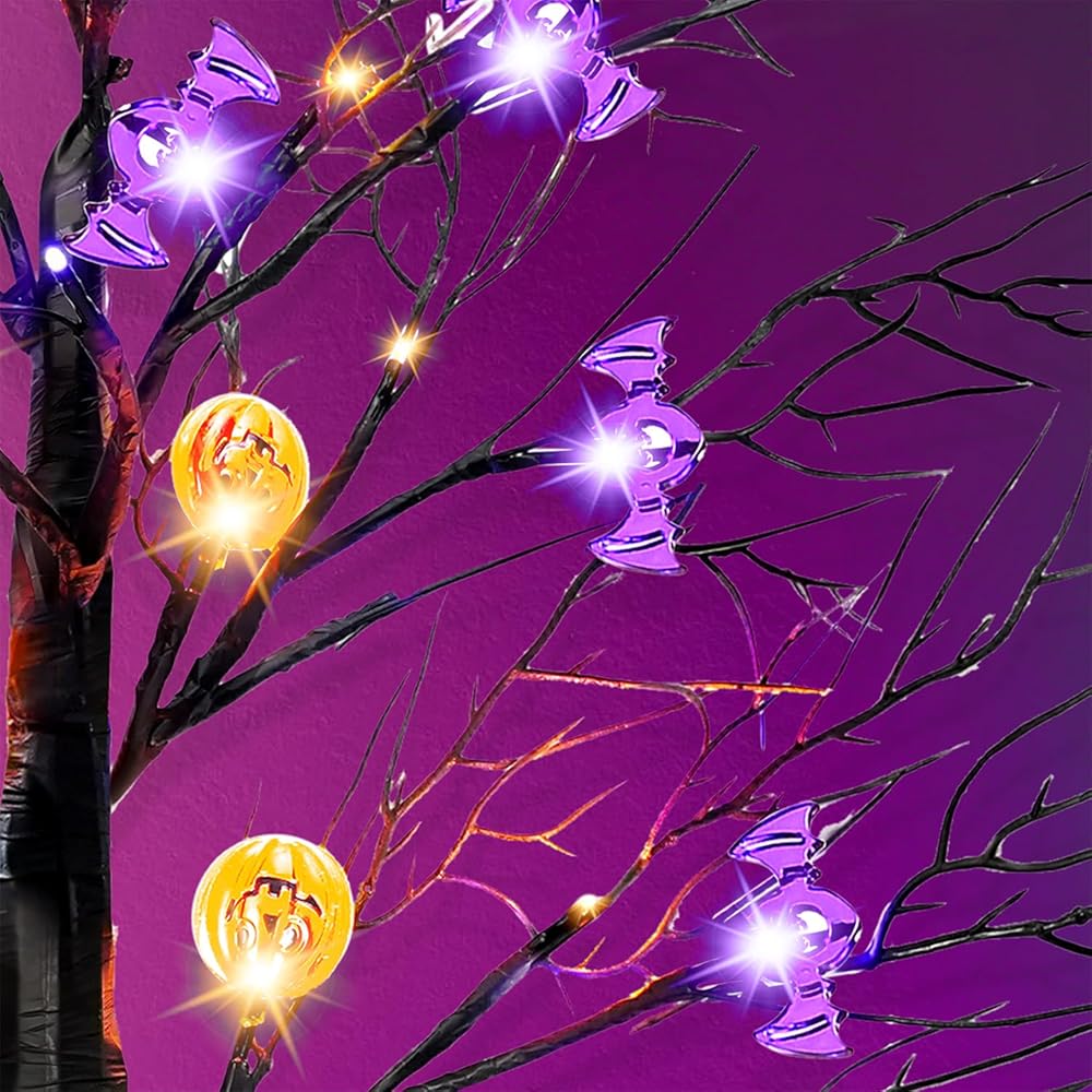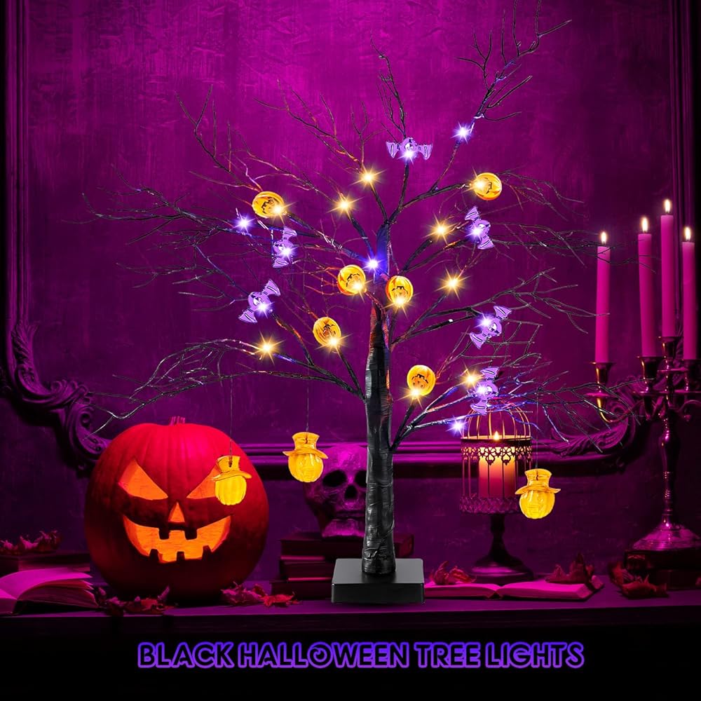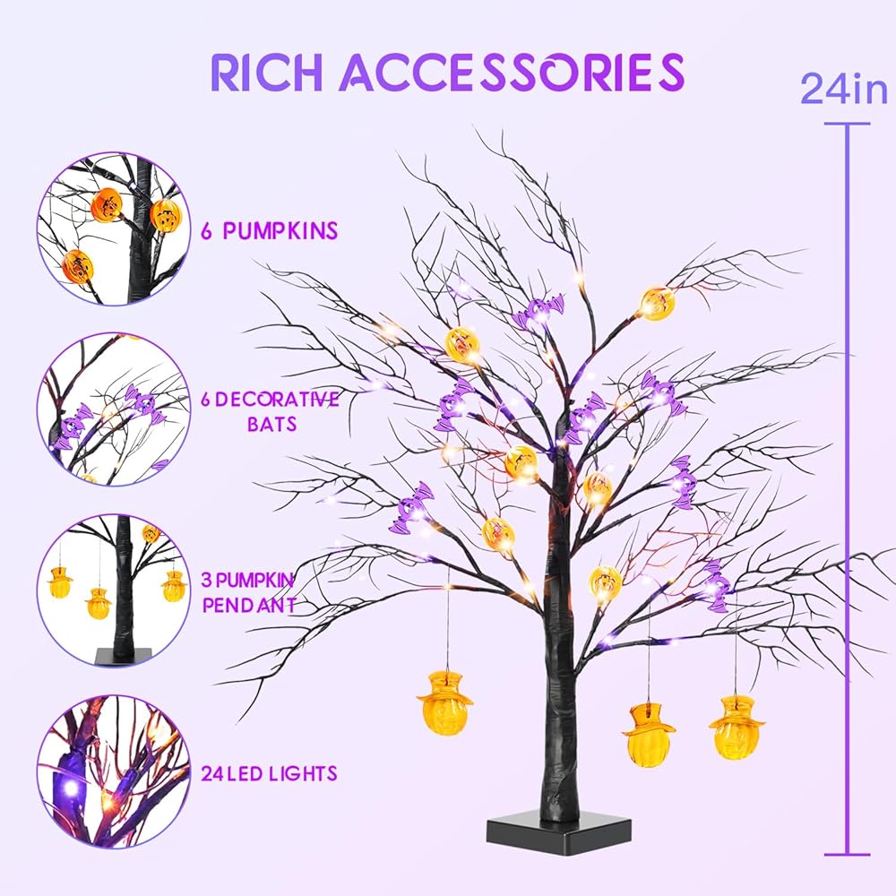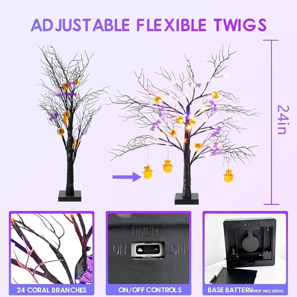 Halloween trees with lights : 2 packs of 24 inch Halloween desktop tree light with 24 constantly lit LED lights, including 6 purple bats 6 pumpkins and 3 orange pumpkin pendants. Using 24 old coral sticks, The branches are wrapped in black tape, creating a eerie feeling when the tree light is lit at night. Placing the black small tree on the table can create a fun and unique Halloween decorations, making it perfect as the centerpiece for Halloween dining tables