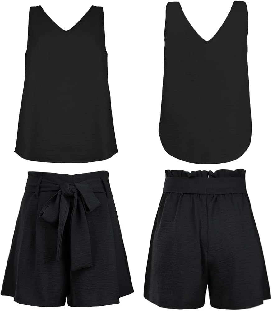 DESIGN: 2 piece crop pants set for women, women's paper bag waist cropped pants casual wide leg casual pants trousers, elastic ruched waist makes it is easy to pull on, back zipper, loose fit style with high elastic waist, belted pants casual cropped length. Front v neck wide strap white long sleeves top, solid.