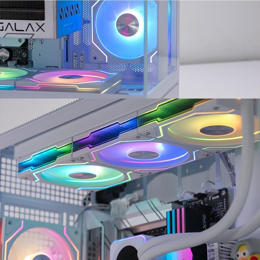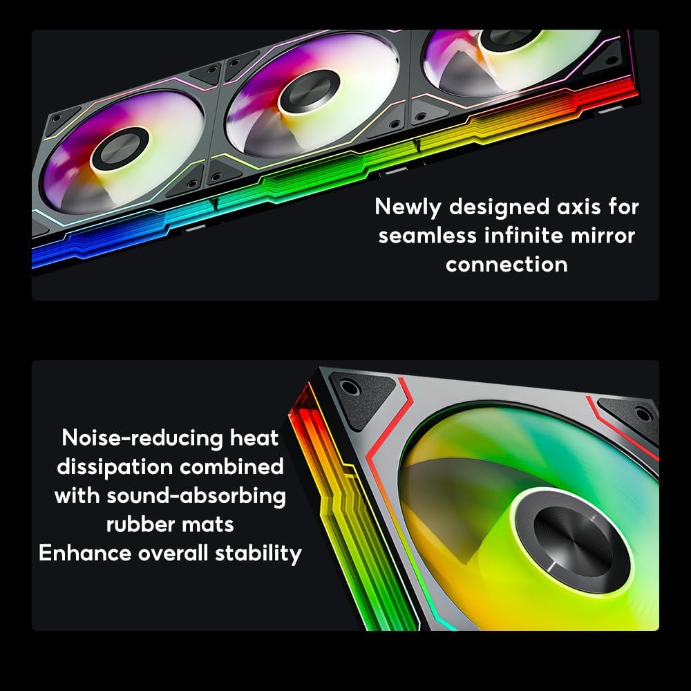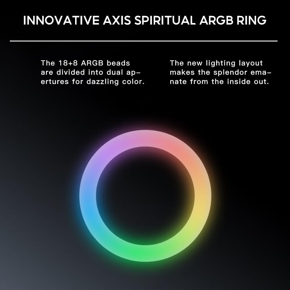 【Innovative design】: Jungle Leopard Star Trall 120mm ARGB Case Fan with double-sided infinite mirror light effect design, high brightness beads and luminous lines to protect the fan brightness and coherence, 1850RPM ± 10% full-load fan speed, PWM intelligent temperature control, HDB bearing Service life > 40000h.Infinity Mirror fan with aluminum alloy applique on the side for deeper lighting effect.