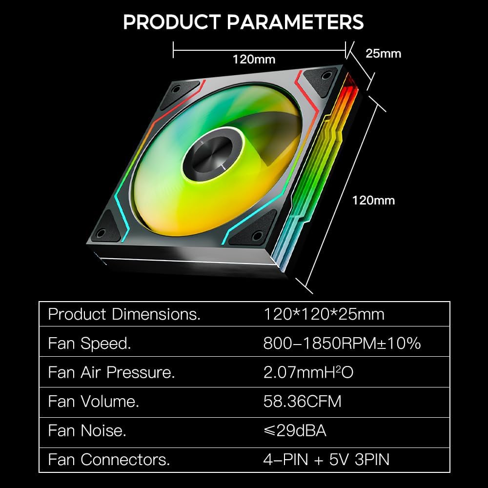【Large air volume and low noise】: Jungle Leopard Star Trall 120mm ARGB Case Fan size 120(L)* 120(W)* 25(H)mm, 4PIN PWM intelligent temperature control, full load speed 1850RPM ± 10%, rated speed: 800~1850RPM ± 10%, 58.36CFM large air volume, 2.07mmH2O high wind pressure, noise ≤ 29dBA, input voltage 12V, input current 0.19A, HDB bearings last longer and help keep the system cool and quiet computing environment.