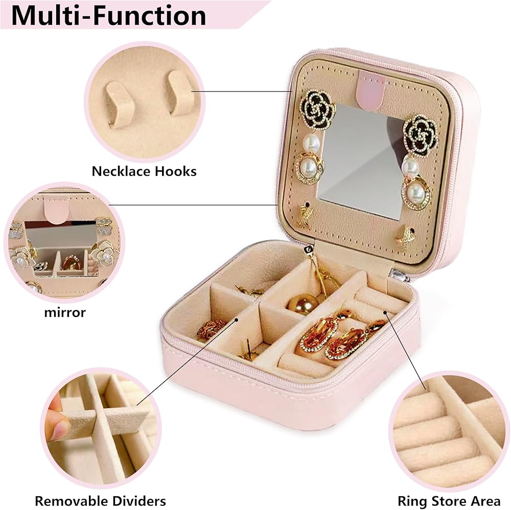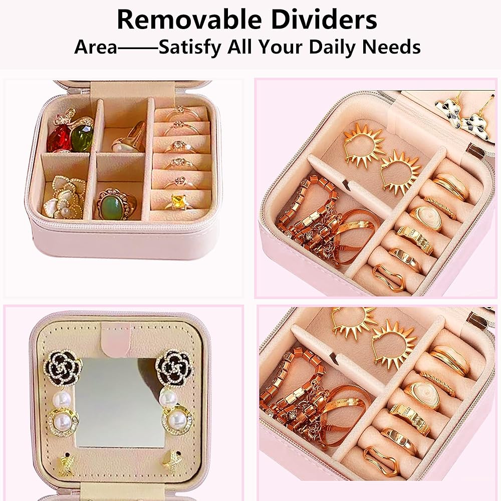 Long-Lasting & Multi-Purpose Space: The Small Travel Jewelry Case that includes sponge strips for rings, compartments with removable dividers, and elasticized pockets for chains and it also can hold small jewelry items such as lipsticks and watches.