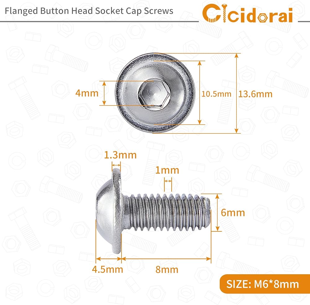 M6-1.0 x 8mm Flanged Button Head Socket Cap Screws Bolts, 304 Stainless Steel 18-8, Allen Socket Drive, Bright Finish, Full Machine Threads, Quantity 50
