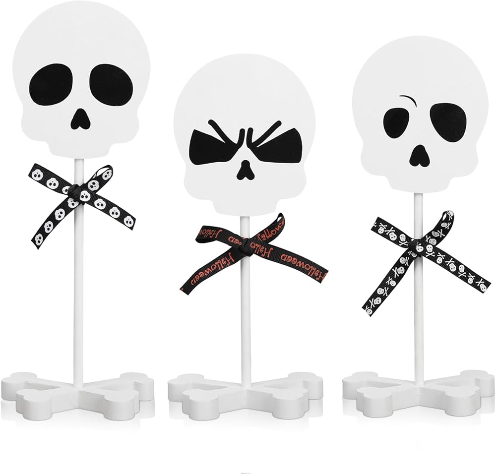 3 Pieces Halloween Wood Table Decorations,Wooden Skull Halloween Tiered Tray Decor,Gothic Standing Block Set for Halloween Party Home Room Decor.(Skull)