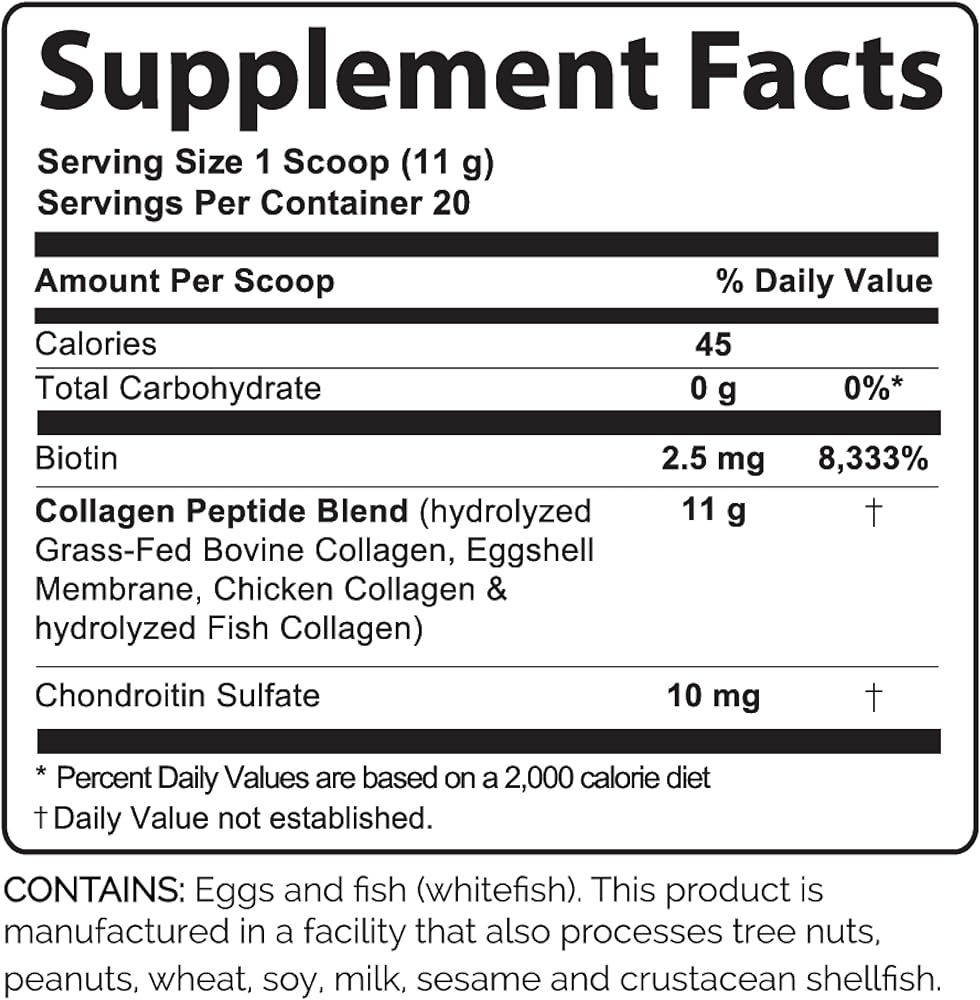 FIVE COLLAGEN TYPES: Types I and III from grass-fed bovine collagen (healthy skin and hair), Type II from pasture-raised chicken collagen (joint health and flexibility), Type V from wild-caught marine collagen (nail strength and growth), and Type X from organic eggshell membrane (joint health and flexibility).