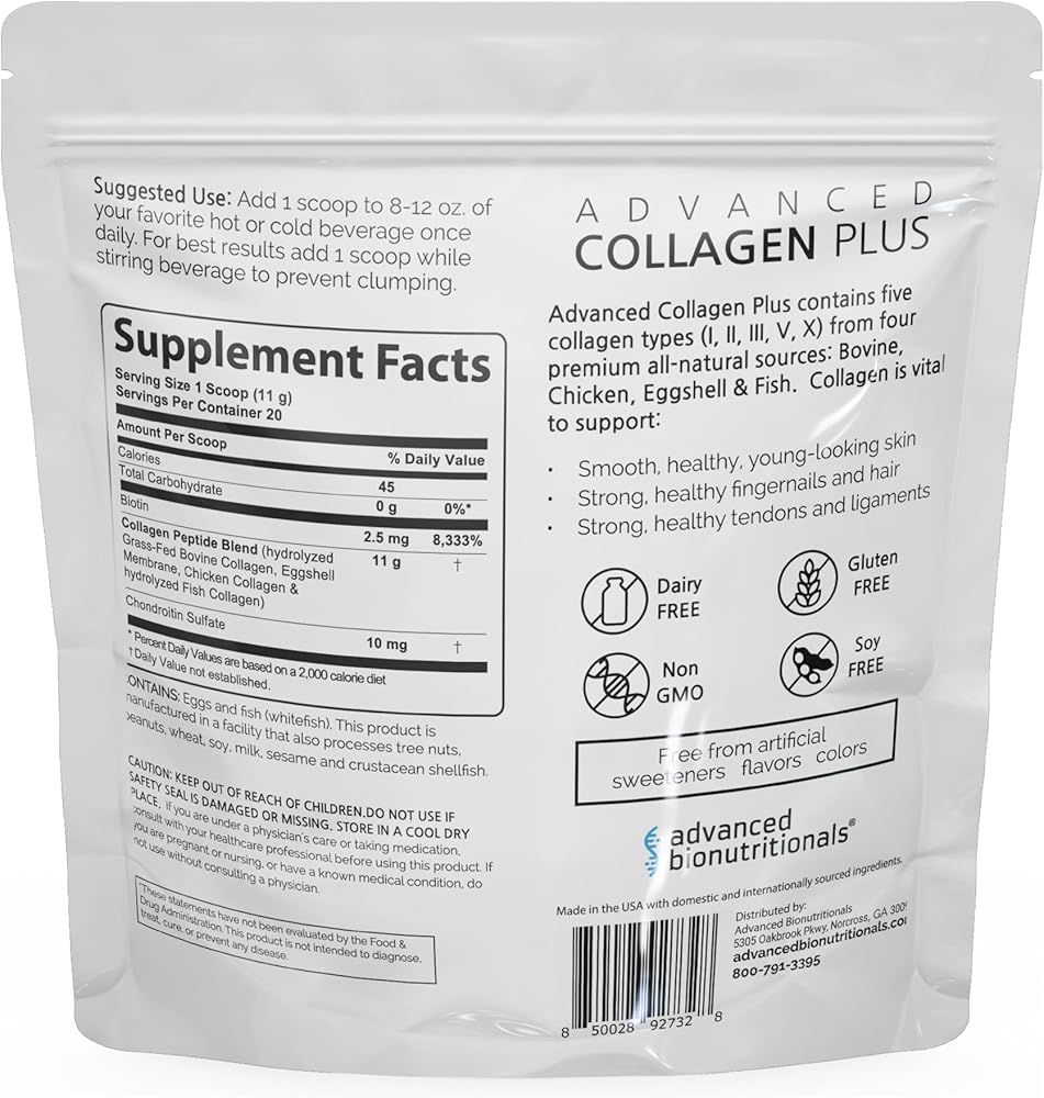 Advanced Bionutritionals Collagen Plus Powder combines 5 collagen types from 4 premium sources. This ensures your body receives a high-quality collagen profile. We also added Biotin and Chondroitin Sulfate for an added boost. Collagen Plus is flavorless and dissolves easily into any hot or cold liquid. While your regular diet may provide proteins, it's crucial to note that collagen proteins are different. They offer a unique blend of amino acids that are scarce in other protein sources. These amino acids are vital to maintain the elasticity of your skin, the mobility of your joints, and the strength of your bones. They also provide the building blocks for keratin which helps to keep your nails strong and your hair shiny. Types I and III from grass-fed bovine collagen (healthy skin and hair), Type II from pasture-raised chicken collagen (joint health and flexibility), Type V from wild-caught marine collagen (nail strength and growth), and Type X from organic eggshell membrane (joint health and flexibility). Collagen Plus blends perfectly in both hot and cold liquids, with no clumps in sight. You won't find any bad taste or unpleasant smell here. This is because we source from only top-notch premium ingredients. This product does not contain dairy, gluten, or soy and is Non-GMO. The recommended serving size is 1 scoop. For the best results, try stirring while pouring it into your morning coffee or favorite beverage. Customers report noticeable changes in as early as 4 weeks but our customers that report the most dramatic results add it to their daily routine. These statements have not been evaluated by the Food and Drug Administration. This product is not intended to diagnose, cure, or prevent a disease.