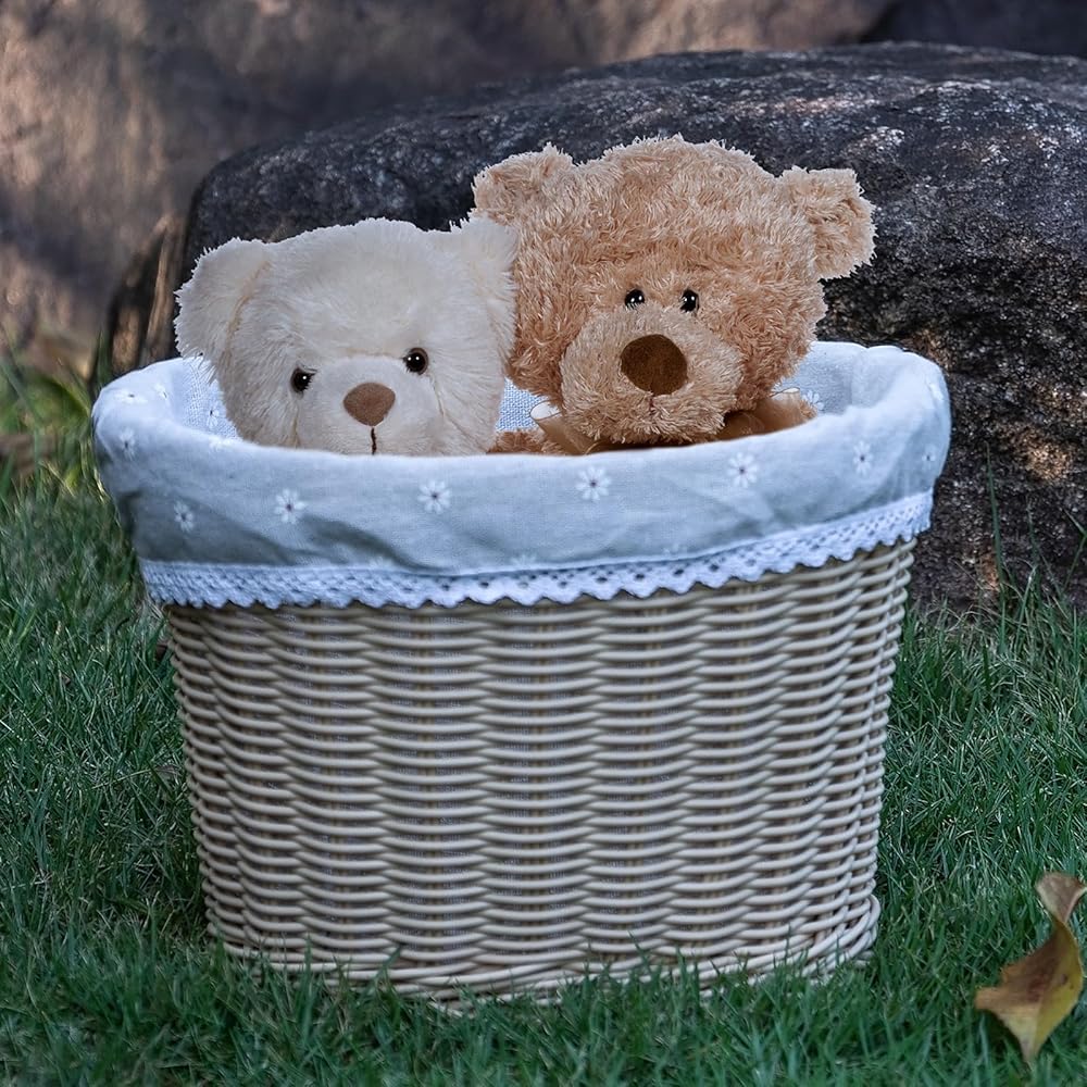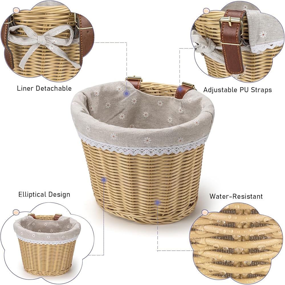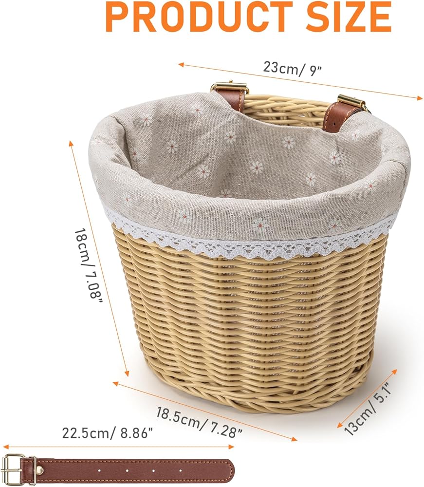 【Size and Capacity】: The bike basket measure 9” L x 5.1" W x 7.08"H, weight limit of 10 pounds. These child-size baskets may look cute, but don't be fooled- they can hold up, too! Enough to accommodate nearly anything, from toys, dolls and milk to textbooks to your backpack. The Liner detachable of the bike basket, designed to prevent your smaller treasures from escaping.