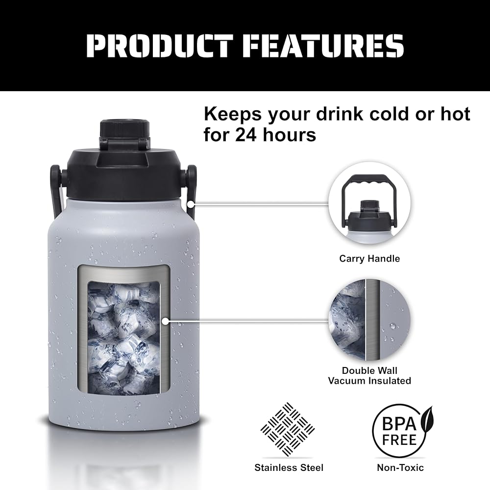 MAXIMUM HYDRATION: Our 64 oz water bottle with sleeve is a stainless steel water bottle sports jug, perfect for ensuring hydration during long workdays or intense workouts