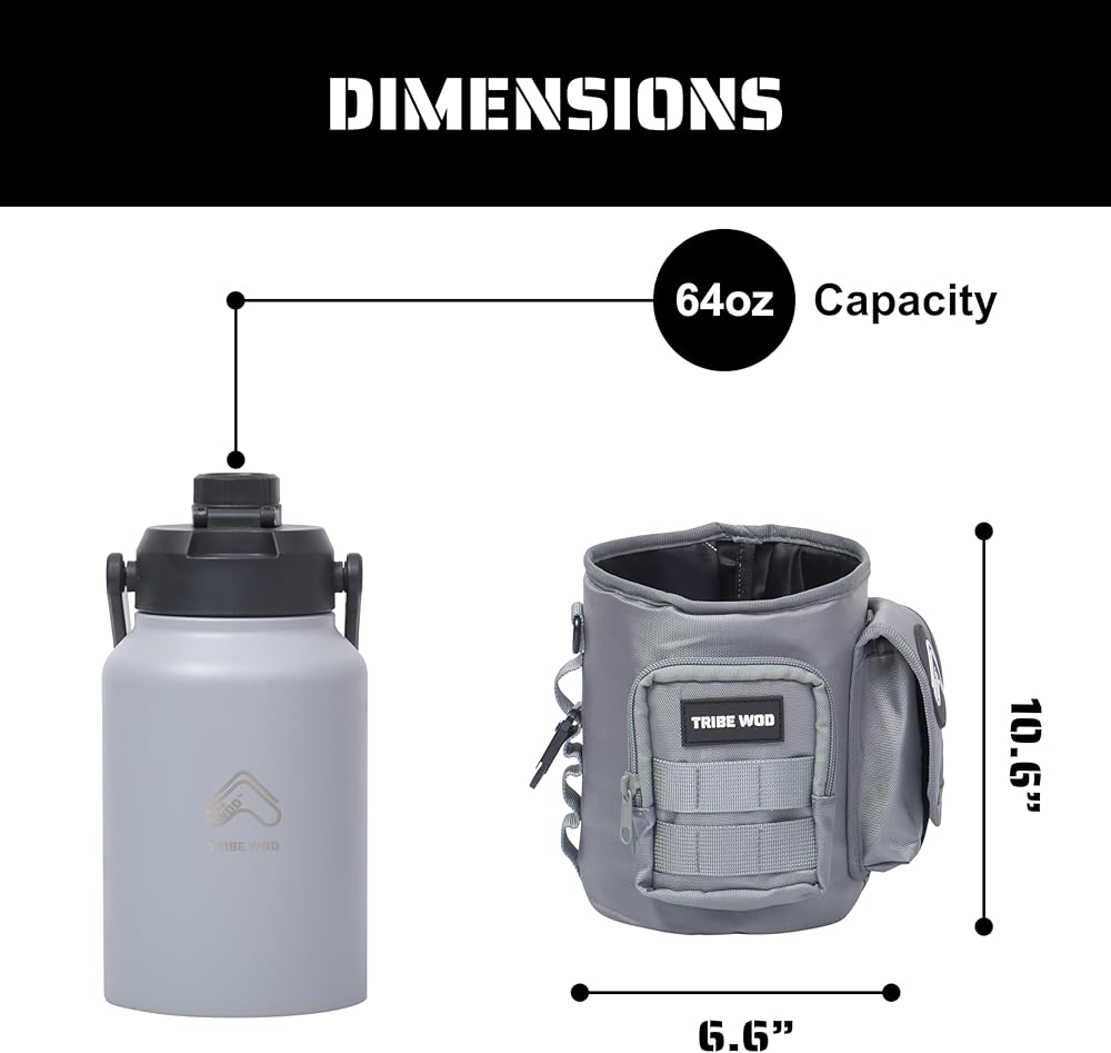 Stay hydrated with this durable and rugged stainless steel Tribe WOD tactical water bottle with removable sleeve. Made from high-quality materials, including double-wall stainless steel and military-grade fabrics, this water carrier is built to withstand tough conditions during hiking, camping, hunting, work, or gym sessions. With a generous 64oz capacity, this water jug provides maximum hydration during long workdays or intense workouts. The double-wall insulation keeps your water cold all day, while the rugged and removable sleeve adds convenience by providing storage space for your keys, wallet, and phone. Sleek and stylish, this water jug is a perfect blend of functionality and modern design.