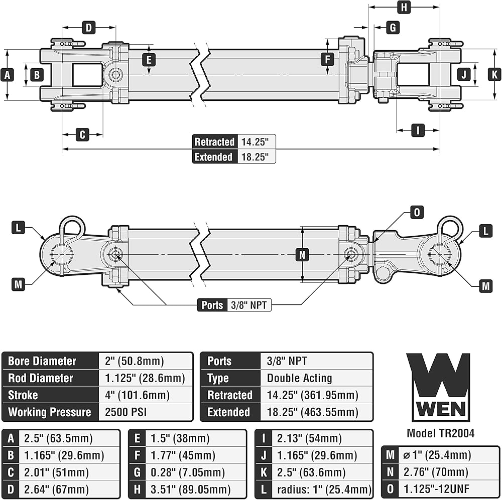 Remember when you had a cylinder that lasted? Maximize reliability in agriculture, construction, manufacturing, machinery, and more with a WEN Tie-Rod Hydraulic Cylinder. This double-acting steel-welded tie-rod hydraulic cylinder creates operating pressures of 2500 PSI. The 3/8-inch NPT port size attaches easily to any standard hydraulic hose. With a 2-inch bore and a 4-inch stroke, this durable cylinder goes from a retracted length of 14.25 inches all the way out to an extended length of 18.25 inches. This cylinder also includes a reinforced O-ring tube seal, a cold-drawn tube to maximize seal life, a 1-inch diameter zinc-plated steel pin, a high-tensile ground and polished chrome-plated rod, an ASTM A536 65-45-12 ductile iron piston, and ductile iron female clevises with grade 8 clamp nuts. And because it's a WEN product, your tie rod cylinder comes backed by a two-year warranty, a stocked inventory of replacement parts and a two-year warranty, all to make sure you remember WEN.