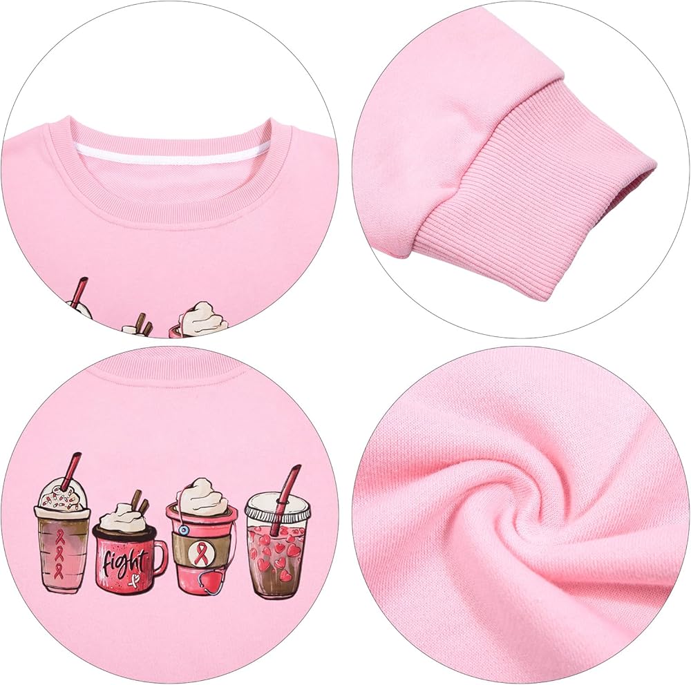 Breast Cancer Awareness Sweatshirt Women Cancer Fight Long Sleeve Shirt Pink Ribbon Halloween Thanksgiving Sweatshirt Coffee Loose Pullover Tops