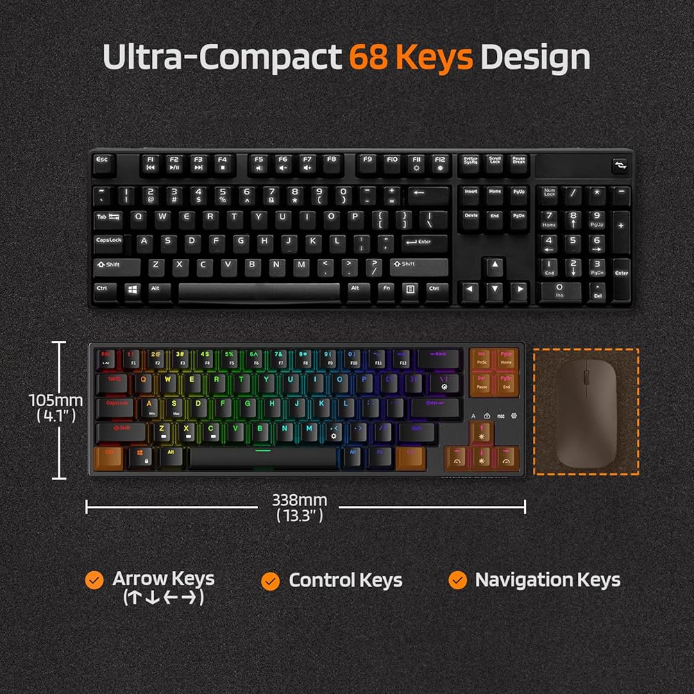 Compact but Practical 65% Layout - Ultra-compact design with 68 keys portable layout. Geared with the practical arrow, navigation, and control keys, it well balanced the characteristic of functional and space-saving.
