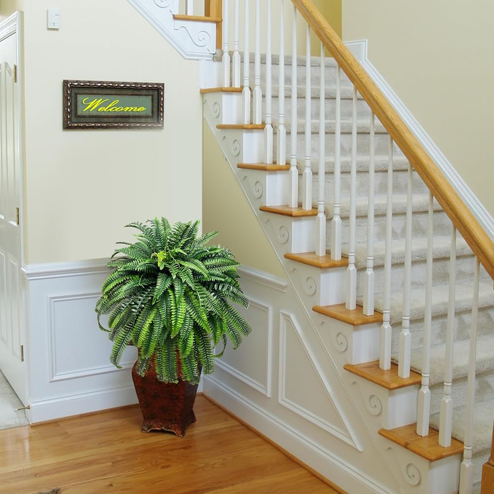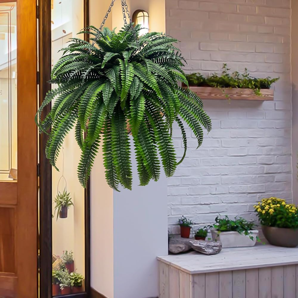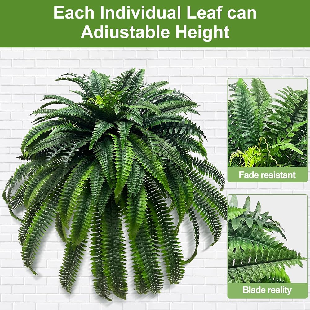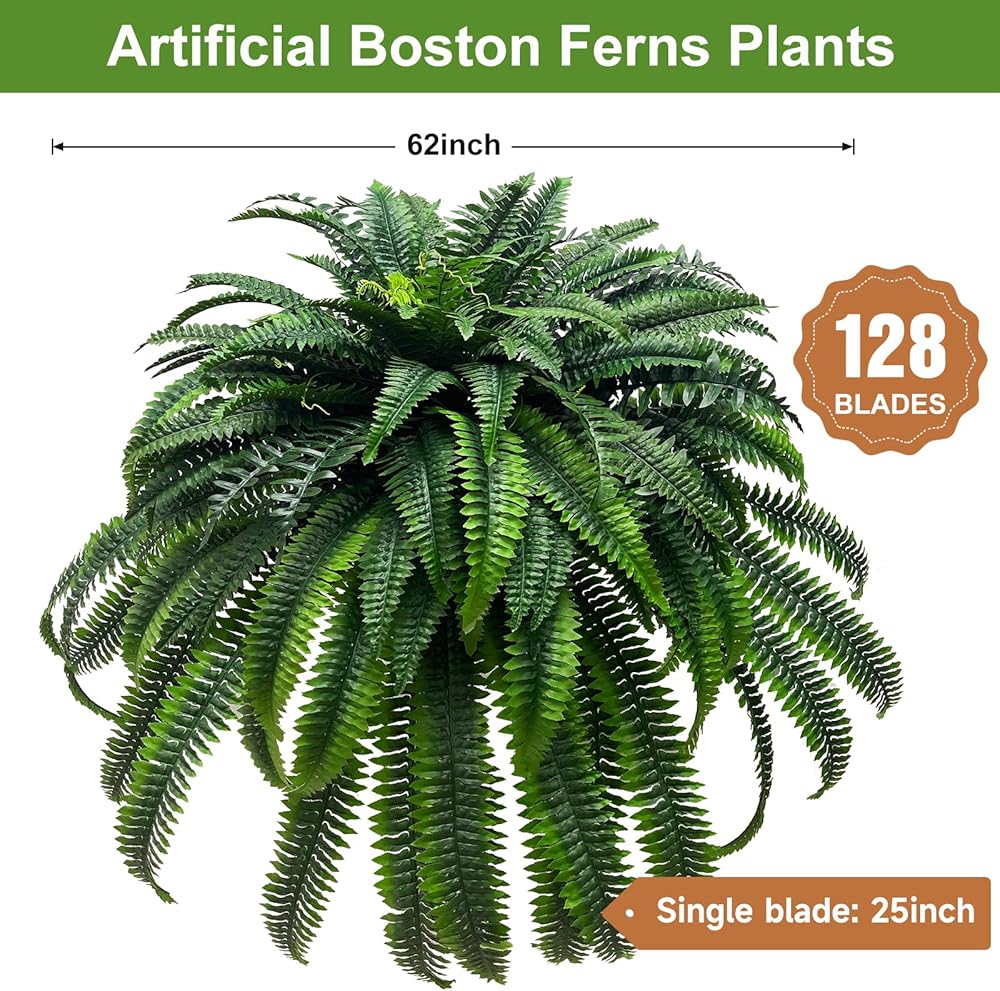 2.Artificial boston fern: Package -1 large fake ferns plants. Each bundle is about 62in (adjustable length) and has 128 flexible stems. You can manually adjust the shape of the stems, to make them look more lush.