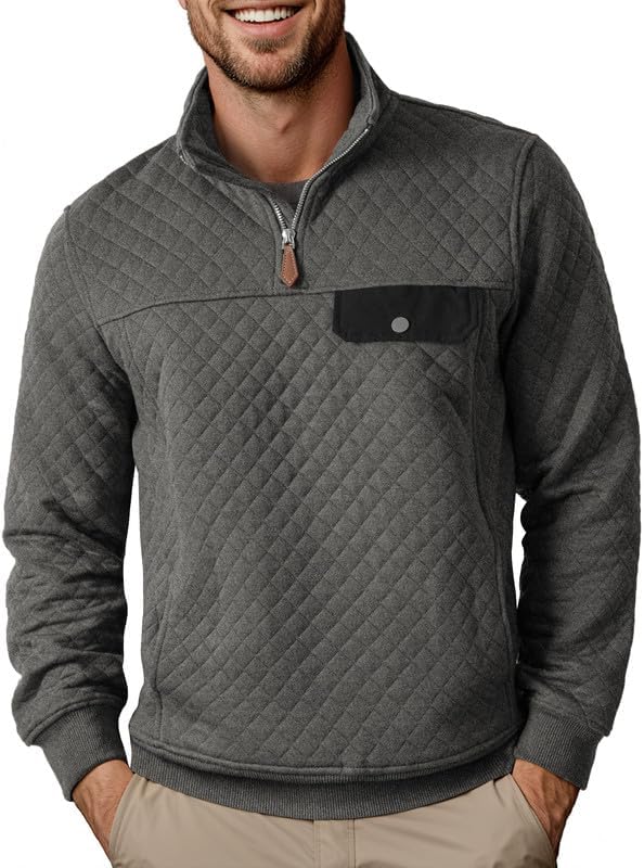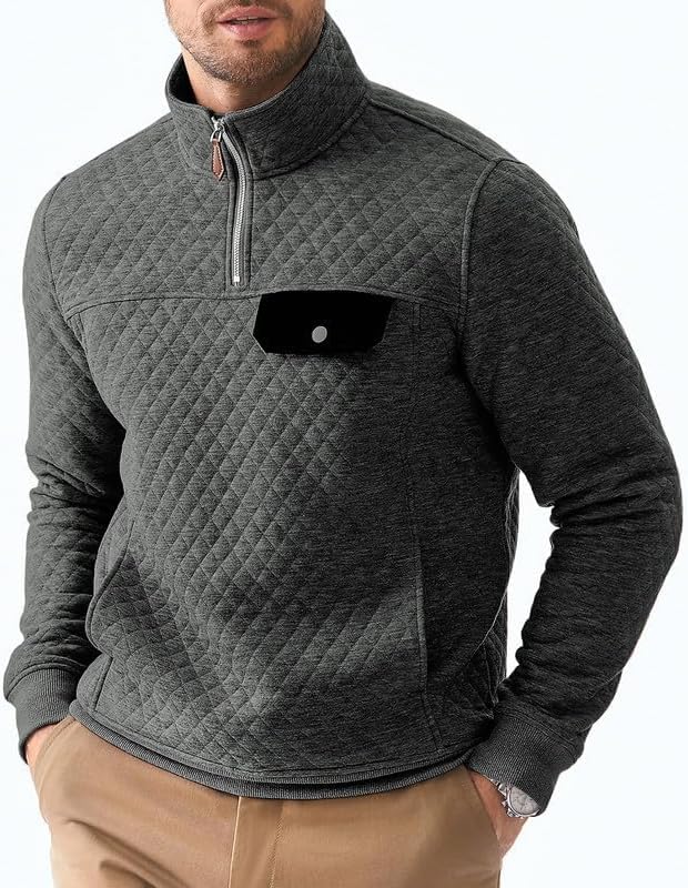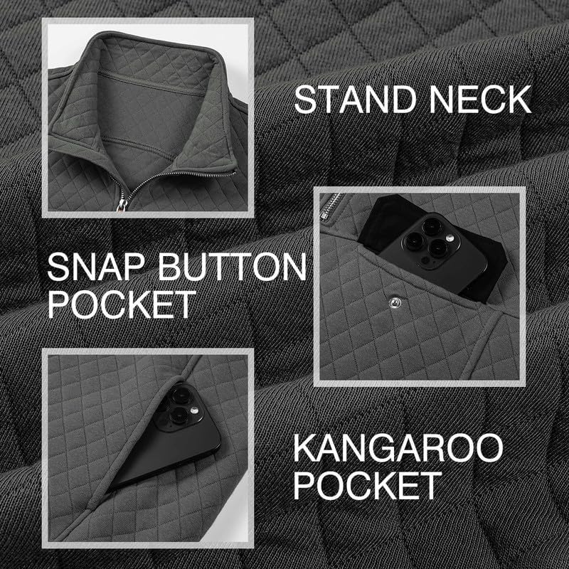 Unique design: The men's quarter zip sweatshirt design in stand collar, long sleeve, v neck, quilted, stand collar, contrast on collar, contrast color, geometric texture, slim fit, ribbed cuffs and hem, chest contrast snap button pocket and two side pokcet to bring small things like keys, phone, wallet, etc. The classic contrast design ensures timeless appeal that never goes out of style.