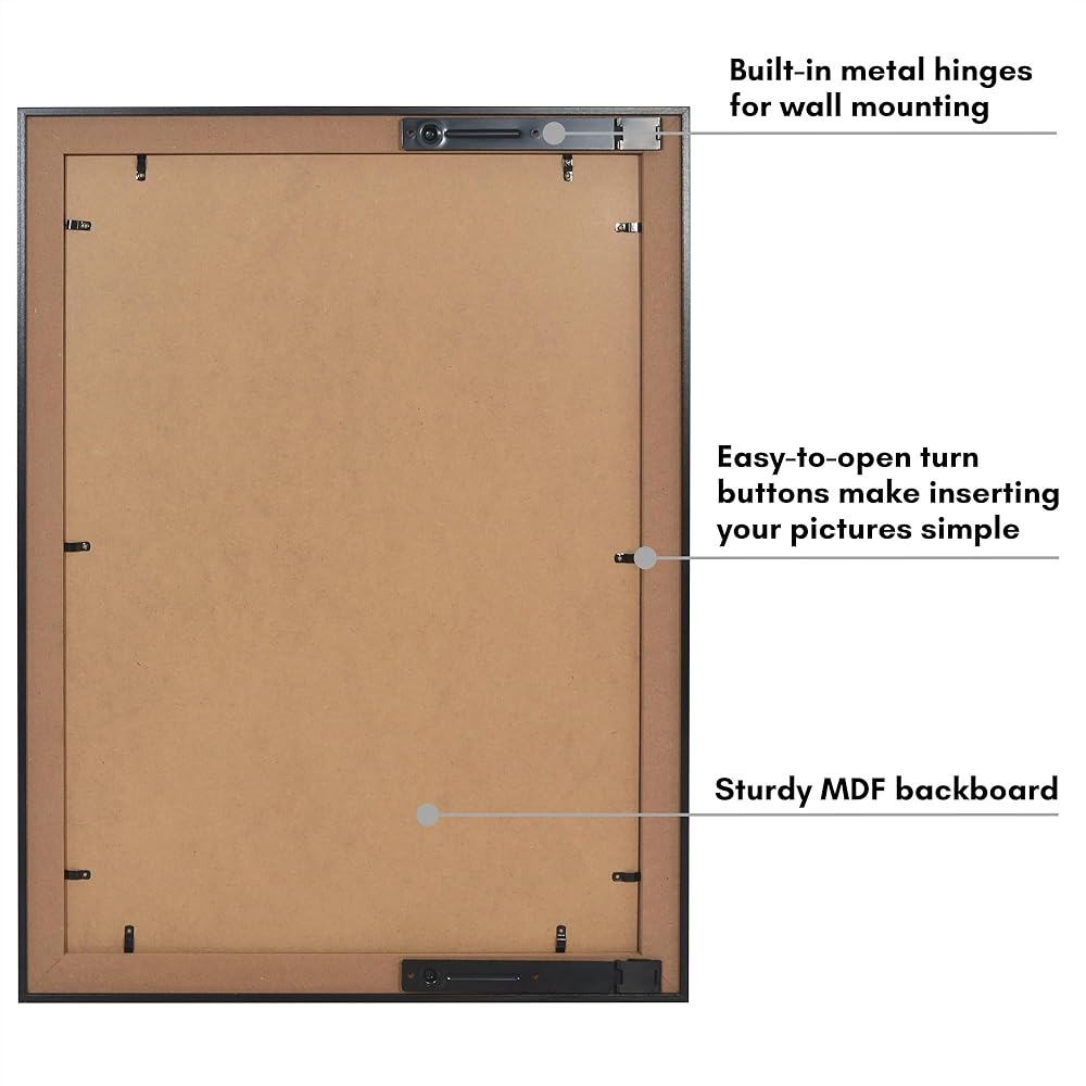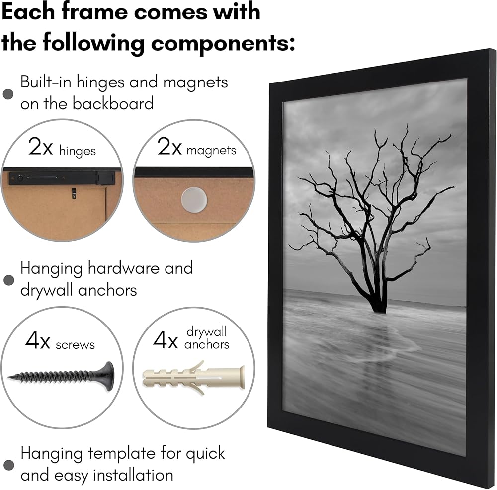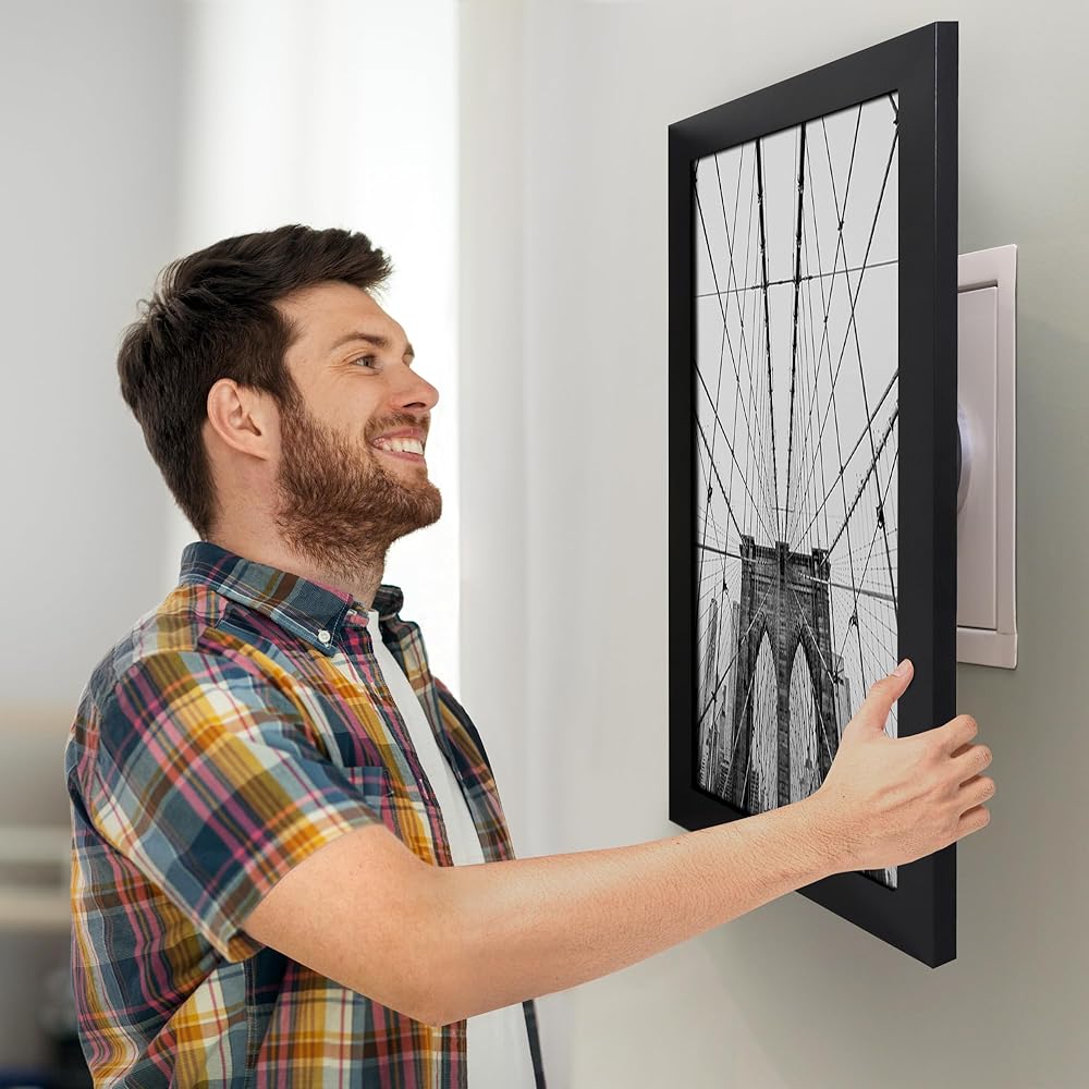 Elevate your home decor with the Americanflat 16x22 concealment picture frame in black. This black picture frame not only showcases your favorite photos or artwork, but provides a discreet and stylish cover for your in-wall safe, access panels, or in-wall storage boxes. Crafted from durable engineered wood (MDF) with a sleek molding, it offers both functionality and style. Featuring a polished plexiglass front, this black frame with a polished plexiglass front hides valuables securely behind the frame. The hinged design allows quick access to the safe without removing the entire frame from the wall. Designed for hassle-free installation, it comes with pre-drilled brackets and detailed instructions, allowing you to easily install it over your in-wall safe or access panels. The timeless design of this 16x22 picture frame blends effortlessly into any home or office decor, adding a polished look to your space. Whether you're looking to hide a safe, valuables, or other important items such as jewelry or cash, this innovative frame offers the perfect solution for those looking to combine home security with elegant interior design. Don't settle for ordinary frames. Invest in lasting quality and functional style with this picture frame. Order your frame now and join thousands of satisfied customers who love our products.