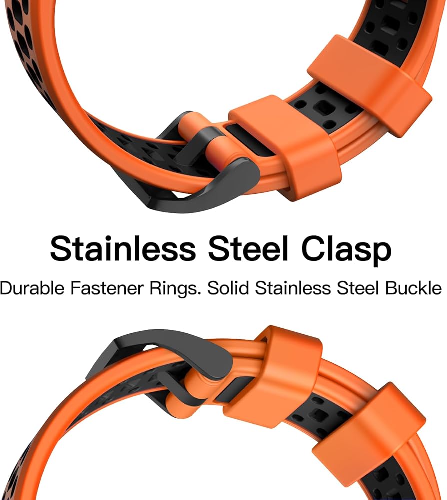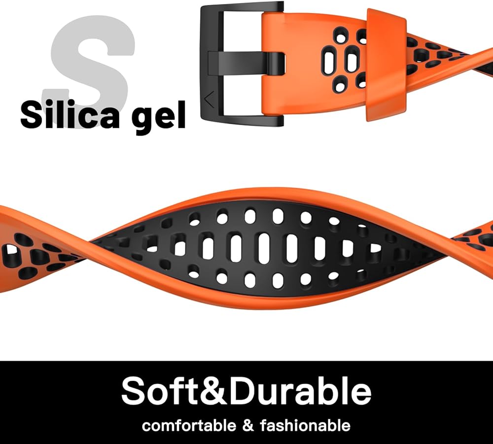 MATERIAL --- This replacement sport band is made of a natural silicone which make it soft, breathable, durable and sturdy. The lightweight material will not let your wrist have any burden even if you are exercising. The bands is reinforced with fastening technology and will not fall off like other straps.