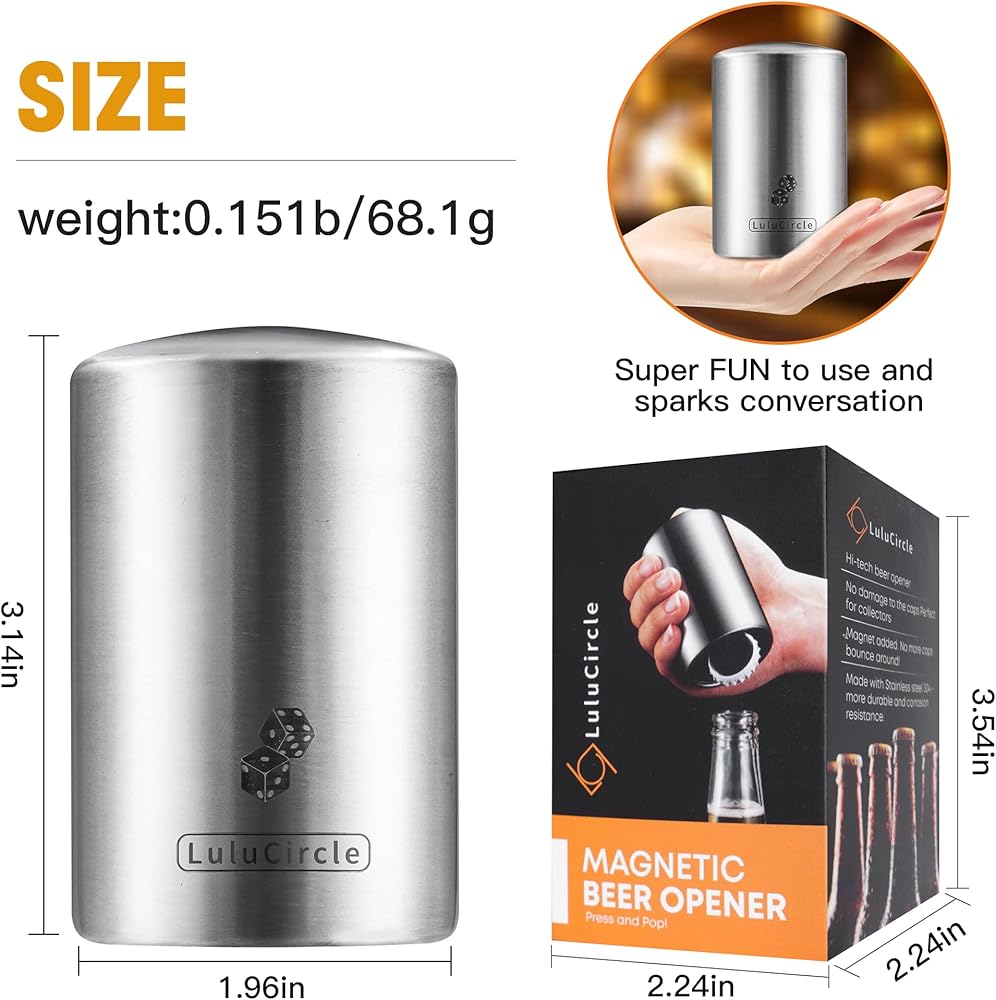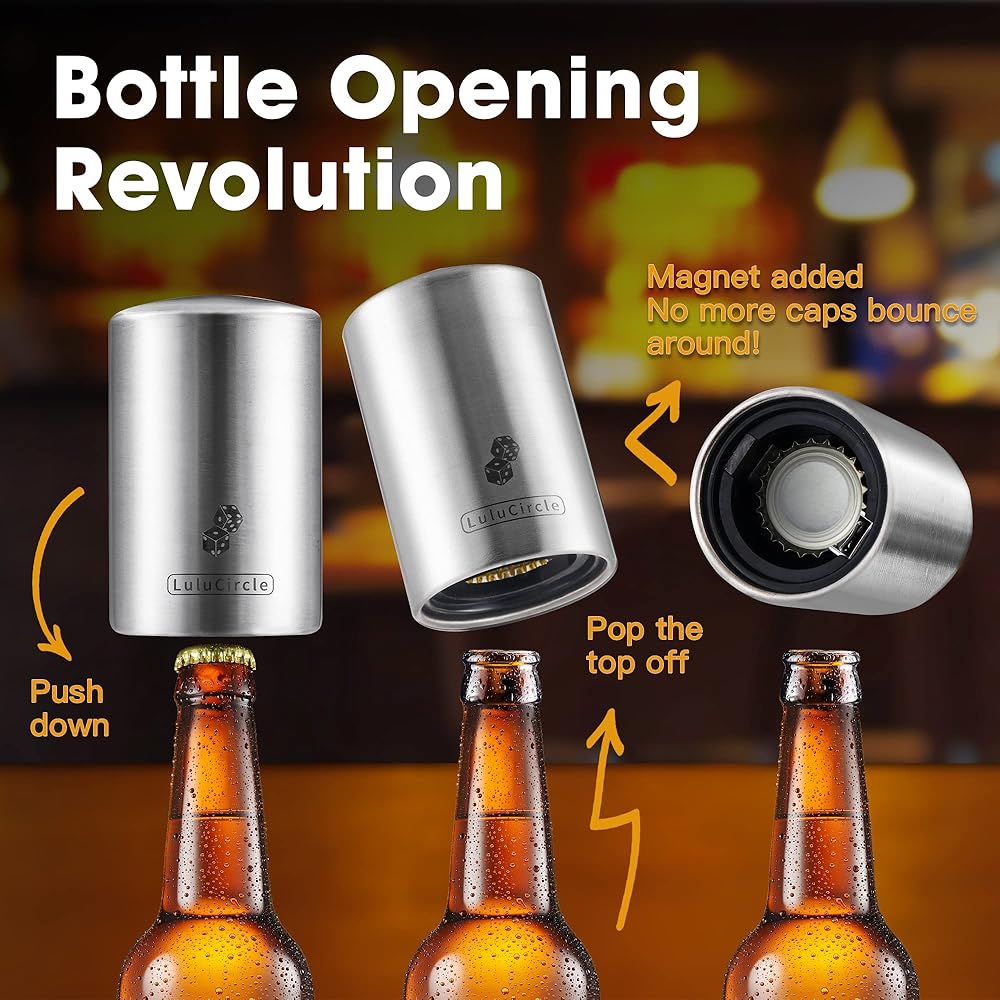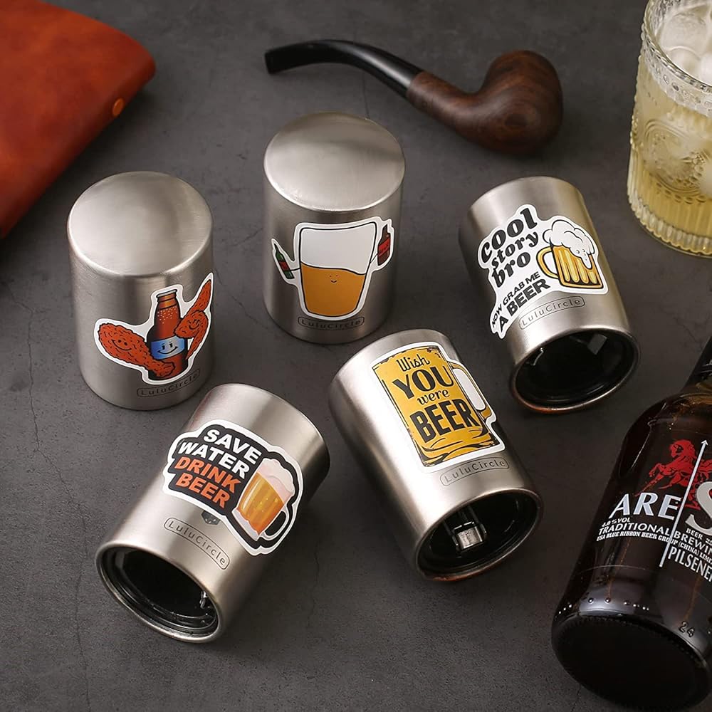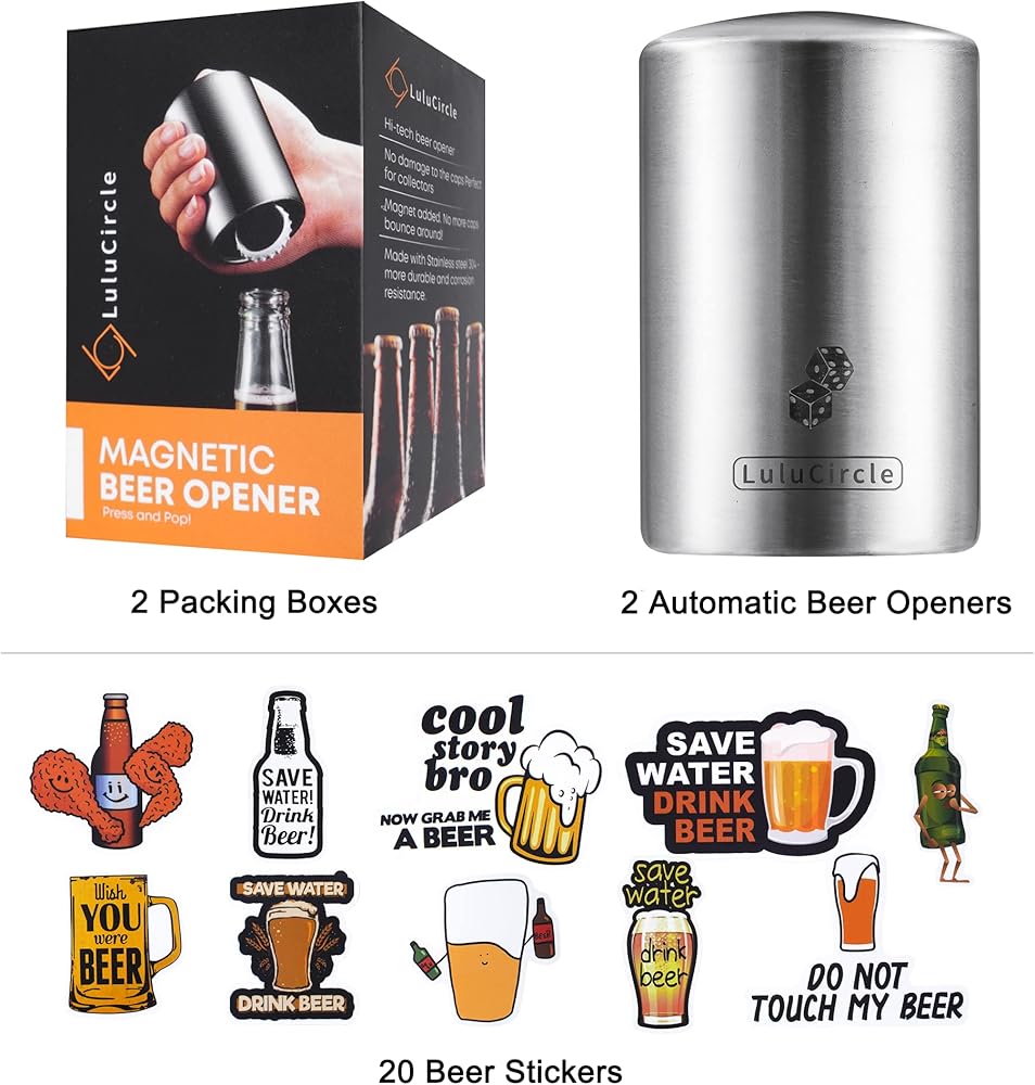 Beer Bottle Opener, Automatic Magnetic Bottle Openers, Funny Gifts, Soda Cap Opener, Stainless Steel Push Down Opener, My Beer Buddy, 2 Openers, 20 Stickers