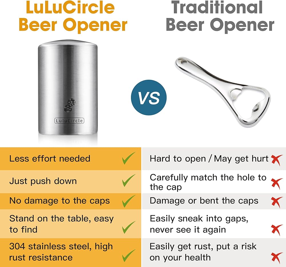 【EASY TO USE】 Just put the opener on the bottle cap and slightly push it down, then you will pop off the cap. The magnet can catch the cap. No more bounced around. Unlike a general beer opener, you do not need to lever and bend the cap. You can get an intact cap with this automatic magnetic bottle opener—no more damage to the cap.