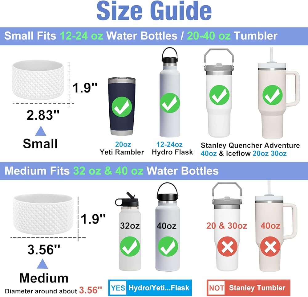 👍 【SMALL BOOT】- Size: 2.9 x 1.65 inches (D x H); Compatible with 12oz 18oz 24oz Hydroflask, 18oz 24oz Thermoflask, 14 18 22oz IRON FLASK, 13oz Contigo, 20oz RITC, 12oz 18oz 24oz Vmini, Stanley Adventure Quencher 20oz 30oz 40oz and Stanley IceFlow 20oz 30oz Tumbler, Simple Modern 30oz 40oz Tumbler. Fit for most vacuum bottles with 2.9'' bottom diameter. NOT COMPATIBLE: Hydroflask trail series 12-24oz.